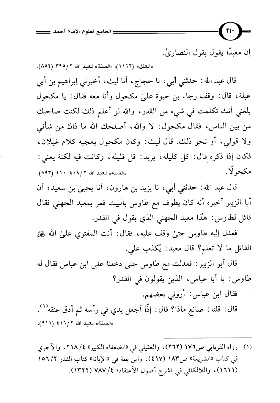 قال عبد اللَّه: حدثني أبي، نا يزيد بن هارون، أنا يحيى بن سعيد، أن أبا الزبير أخبره أنه كان يطوف مع طاوس بالبيت فمر بمعبد الجهني فقال قائل لطاوس: هذا معبد الجهني الذي يقول في القدر.