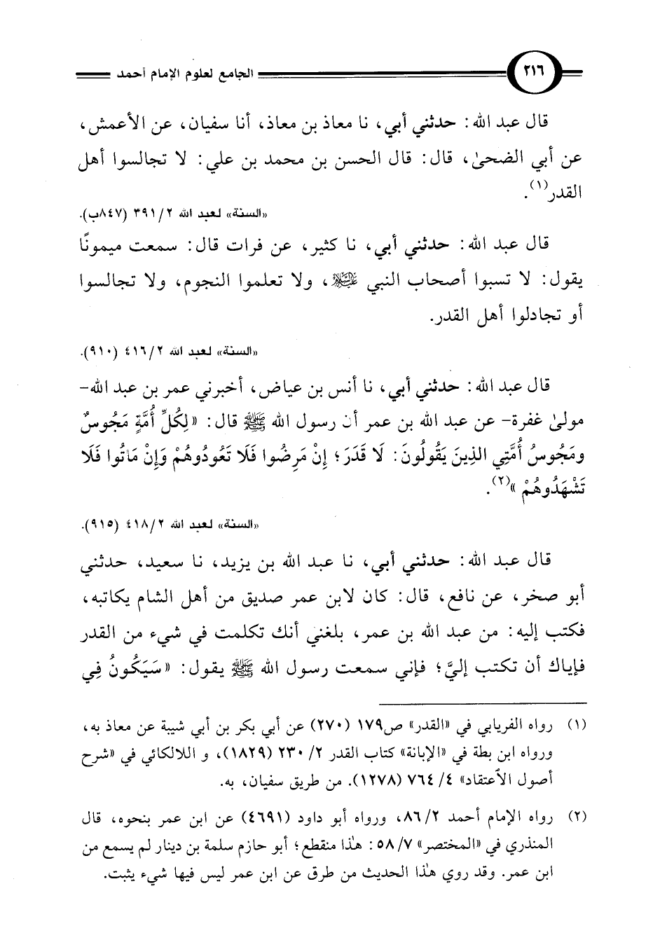 قال عبد اللَّه: حدثني أبي، نا أنس بن عياض، أخبرني عمر بن عبد اللَّه -مولى غفرة- عن عبد اللَّه بن عمر أنَّ رسول اللَّه -صلى اللَّه عليه وسلم- قال: "لِكُلِّ أُمَّةٍ مَجُوسٌ ومَجُوسُ أُمَّتِي الذِينَ يَقُولُون: لَا قَدَرَ؛ إِنْ مَرِضُوا فَلَا تَعُودُوهُمْ وَإِنْ مَاتُوا فَلَا تَشْهَدُوهُمْ" (¬2).