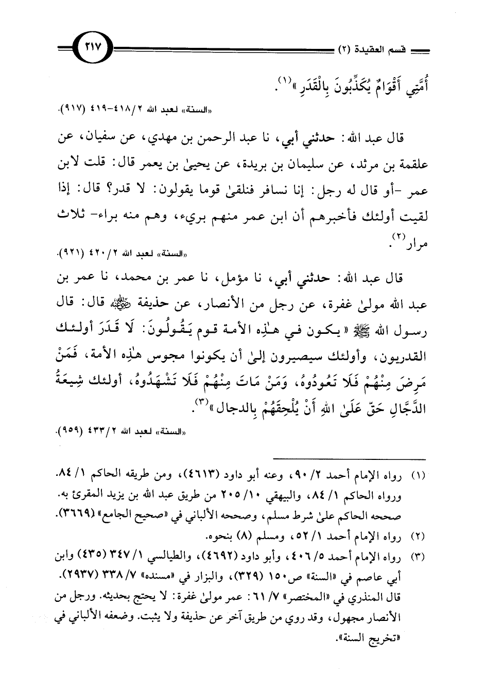 قال عبد اللَّه: حدثني أبي، نا عبد الرحمن بن مهدي، عن سفيان، عن علقمة بن مرثد، عن سليمان بن بريدة، عن يحيى بن يعمر قال: قلت لابن عمر -أو قال له رجل: إنا نسافر فنلقى قوما يقولون: لا قدر؟ قال: إذا لقيت أولئك فأخبرهم أن ابن عمر منهم بريء، وهم منه براء- ثلاث مرار (¬2).