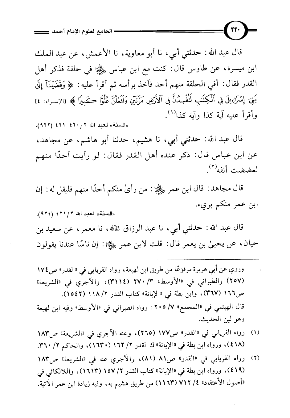 قال عبد اللَّه: حدثني أبي، نا أبو معاوية، نا الأعمش، عن عبد الملك ابن ميسرة، عن طاوس قال: كنت مع ابن عباس -رضي اللَّه عنهما- في حلقة فذكر أهل القدر فقال: أفي الحلقة منهم أحد فآخذ برأسه ثم أقرأ عليه: {وَقَضَيْنَا إِلَى بَنِي إِسْرَائِيلَ فِي الْكِتَابِ لَتُفْسِدُنَّ فِي الْأَرْضِ مَرَّتَيْنِ وَلَتَعْلُنَّ عُلُوًّا كَبِيرًا (4)} [الإسراء: 4] وأقرأ عليه آية كذا وآية كذا (¬1).