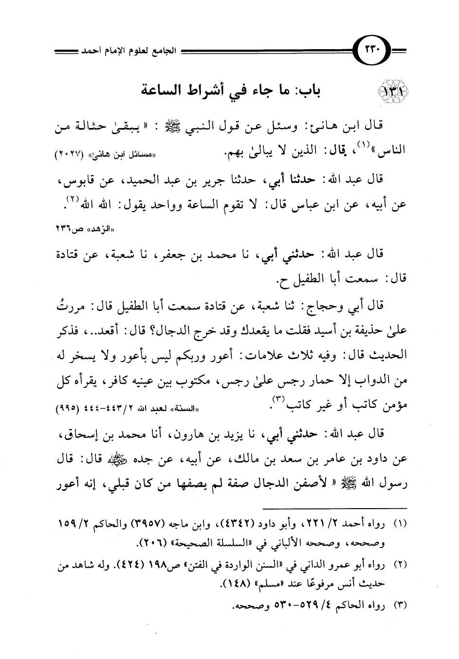 قال أبي وحجاج: ثنا شعبة، عن قتادة سمعت أبا الطفيل قال: مررتُ على حذيفة بن أسيد فقلت ما يقعدك وقد خرج الدجال؟ قال: أقعد. .، فذكر الحديث قال: وفيه ثلاث علامات: أعور وربكم ليس بأعور ولا يسخر له من الدواب إلا حمار رجس على رجس، مكتوب بين عينيه كافر، يقرأه كل مؤمن كاتب أو غير كاتب (¬3).