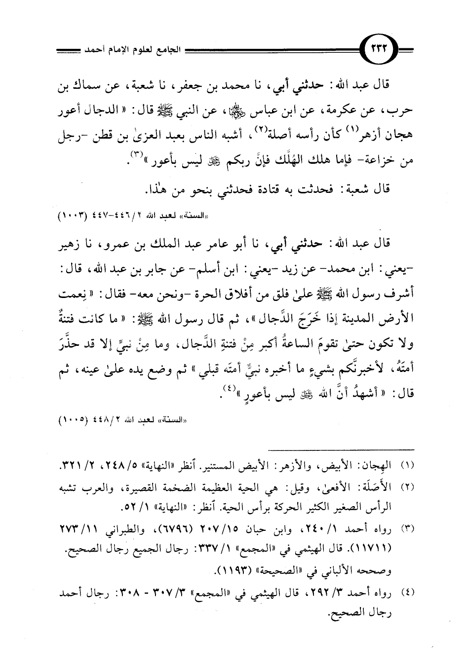 قال عبد اللَّه: حدثني أبي، نا محمد بن جعفر، نا شعبة، عن سماك بن حرب، عن عكرمة، عن ابن عباس -رضي اللَّه عنهما-، عن النبي -صلى اللَّه عليه وسلم- قال: "الدجال أعور هجان أزهر (¬1) كأن رأسه أصلة (¬2)، أشبه الناس بعبد العزى بن قطن -رجل من خزاعة- فإما هلك الهُلَّك فإنَّ ربكم عَزَّ وَجَلَّ ليس بأعور" (¬3).