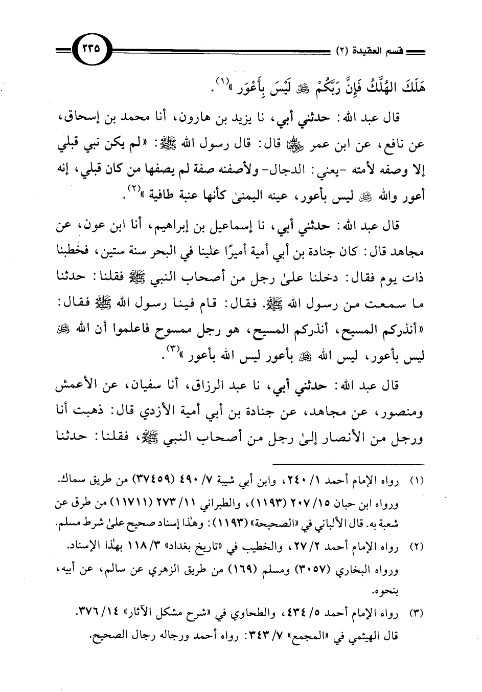 قال عبد اللَّه: حدثني أبي، نا إسماعيل بن إبراهيم، أنا ابن عون، عن مجاهد قال: كان جنادة بن أبي أمية أميرًا علينا في البحر سنة ستين، فخطبنا ذات يوم فقال: دخلنا على رجل من أصحاب النبي -صلى اللَّه عليه وسلم- فقلنا: حدثنا ما سمعت من رسول اللَّه -صلى اللَّه عليه وسلم-. فقال: قام فينا رسول اللَّه -صلى اللَّه عليه وسلم- فقال: "أنذركم المسيح، أنذركم المسيح، هو رجل ممسوح فاعلموا أن اللَّه عَزَّ وَجَلَّ ليس بأعور، ليس اللَّه عَزَّ وَجَلَّ بأعور ليس اللَّه بأعور" (¬3).