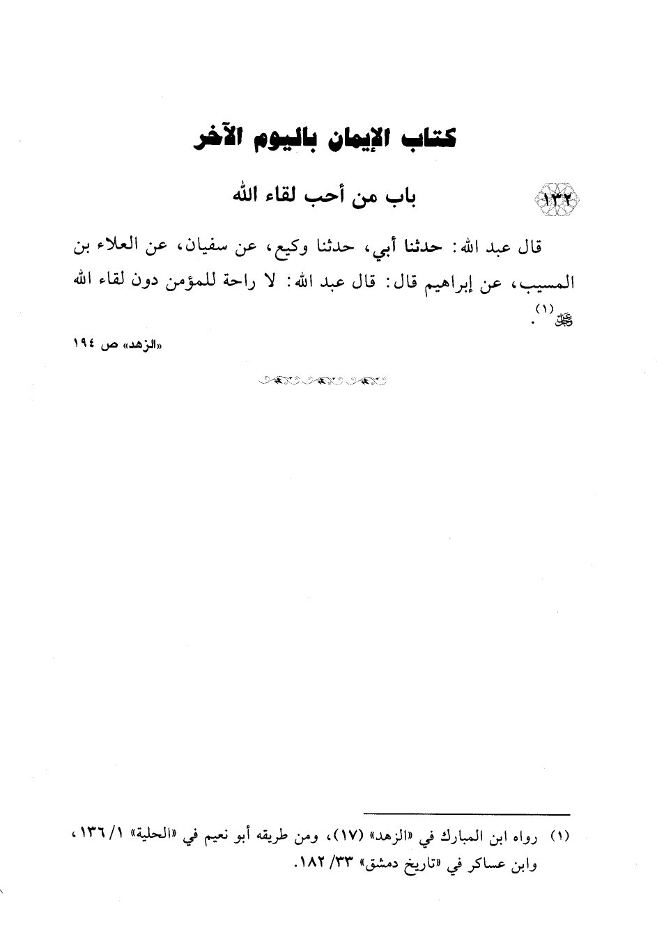 قال عبد اللَّه: حدثنا أبي، حدثنا وكيع، عن سفيان، عن العلاء بن المسيب، عن إبراهيم قال: قال عبد اللَّه: لا راحة للمؤمن دون لقاء اللَّه (¬1).