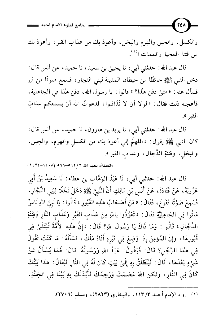 قال عبد اللَّه: حدثني أبي، نا يزيد بن هارون، نا حميد، عن أنس قال: كان النبي -صلى اللَّه عليه وسلم- يقول: "اللهمَّ إني أعوذ بك من الكسلِ والهرمِ، والجبن، والبخلِ، وفتنةِ الدَّجال، وعذاب القبر".