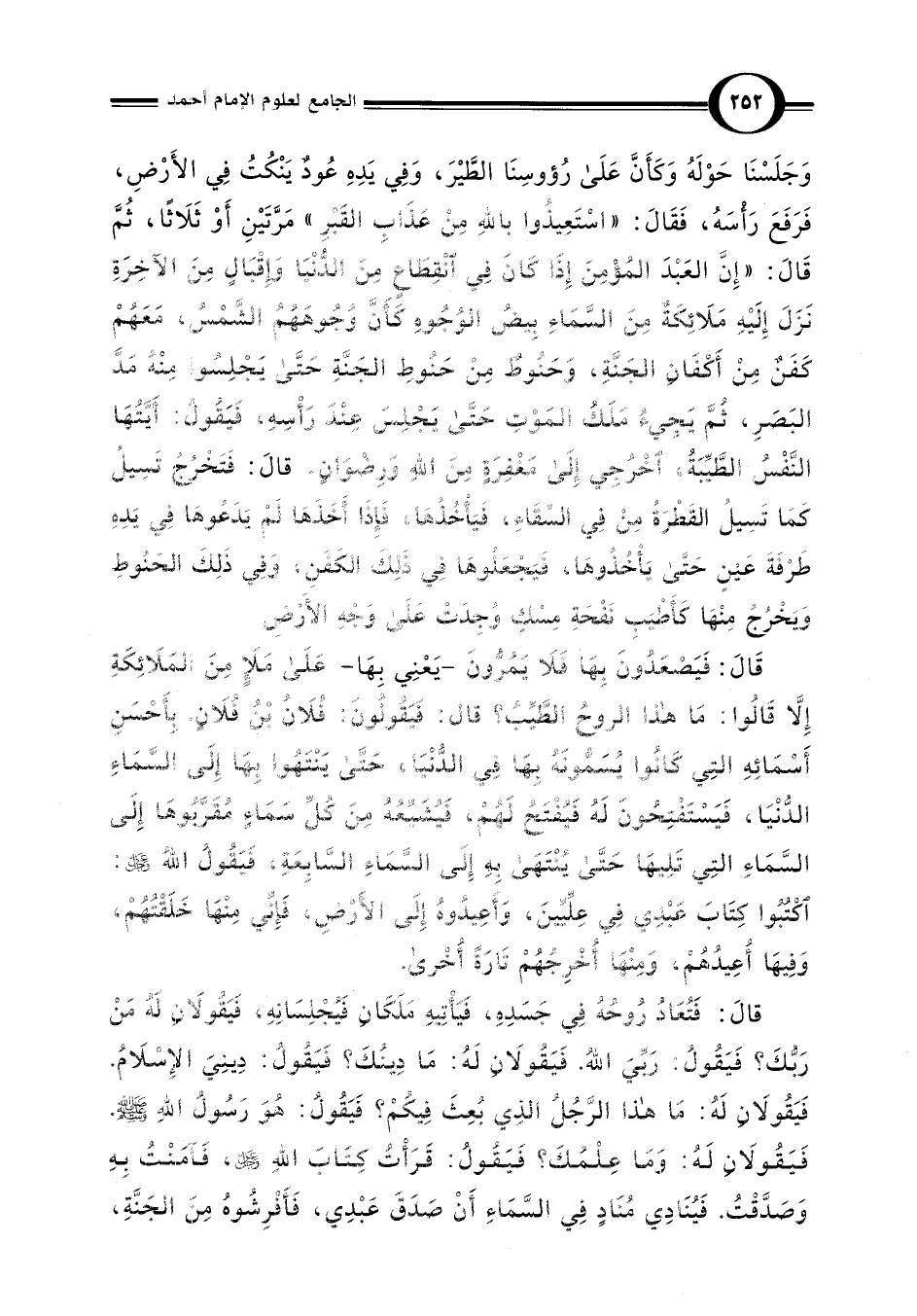 وَجَلَسْنَا حَوْلَهُ وَكَأَنَّ عَلَى رُءُوسِنَا الطَّيْرَ، وَفِي يَدِهِ عُودٌ يَنْكُتُ فِي الْأَرْضِ، فَرَفَعَ رَأْسَهُ، فَقَالَ: "اسْتَعِيذُوا بِاللَّهِ مِنْ عَذَابِ الْقَبْرِ" مَرَّتَيْنِ أَوْ ثَلَاثًا، ثُمَّ قَالَ: "إِنَّ الْعَبْدَ الْمُؤْمِنَ إِذَا كَانَ فِي انْقِطَاعٍ مِنَ الدُّنْيَا وَإِقْبَالٍ مِنَ الْآخِرَةِ نَزَلَ إِلَيْهِ مَلَائِكَةٌ مِنَ السَّمَاءِ بِيضُ الْوُجُوهِ كَأَنَّ وُجُوهَهُمُ الشَّمْسُ، مَعَهُمْ كَفَنٌ مِنْ أَكْفَانِ الْجَنَّةِ، وَحَنُوطٌ مِنْ حَنُوطِ الْجَنَّةِ حَتَّى يَجْلِسُوا مِنْهُ مَدَّ الْبَصَرِ، ثُمَّ يَجِيءُ مَلَكُ الْمَوْتِ، عَلَيْهِ السَّلَامُ، حَتَّى يَجْلِسَ عِنْدَ رَأْسِهِ، فَيَقُولُ: أَيَّتُهَا النَّفْسُ الطَّيِّبَةُ، اخْرُجِي إِلَى مَغْفِرَةٍ مِنَ اللَّهِ وَرِضْوَانٍ. قَالَ: فَتَخْرُجُ تَسِيلُ كَمَا تَسِيلُ الْقَطْرَةُ مِنْ فِي السِّقَاءِ، فَيَأْخُذُهَا، فَإِذَا أَخَذَهَا لَمْ يَدَعُوهَا فِي يَدِهِ طَرْفَةَ عَيْنٍ حَتَّى يَأْخُذُوهَا، فَيَجْعَلُوهَا فِي ذَلِكَ الْكَفَنِ، وَفِي ذَلِكَ الْحَنُوطِ وَيَخْرُجُ مِنْهَا كَأَطْيَبِ نَفْحَةِ مِسْكٍ وُجِدَتْ عَلَى وَجْهِ الْأَرْضِ