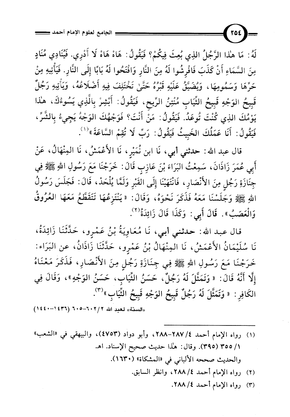 قال عبد اللَّه: حدثني أبي، نَا مُعَاوِيَةُ بْنُ عَمْرٍو، حَدَّثَنَا زَائِدَةُ، نَا سُلَيْمَانُ الْأَعْمَشُ، نَا الْمِنْهَالُ بْنُ عَمْرٍو، حَدَّثَنَا زَاذَانُ، عن الْبَرَاءُ: خَرَجْنَا مَعَ رَسُولِ اللَّهِ صَلَّى اللَّهُ عَلَيْهِ وَسَلَّمَ فِي جِنَازَةِ رَجُلٍ مِنَ الْأَنْصَارِ، فَذَكَرَ مَعْنَاهُ إِلَّا أَنَّهُ قَالَ: "وَتَمَثَّلَ لَهُ رَجُلٌ، حَسَنُ الثِّيَابِ، حَسَنُ الْوَجْهِ"، وَقَالَ فِي الْكَافِرِ: "وَتَمَثَّلَ لَهُ رَجُلٌ قَبِيحُ الْوَجْهِ قَبِيحُ الثِّيَابِ (¬3) ".