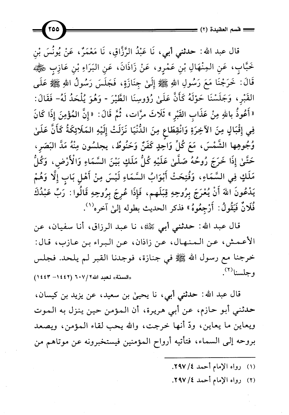قال عبد اللَّه: حدثني أبي، نَا عَبْدُ الرَّزَّاقِ، نَا مَعْمَرٌ، عَنْ يُونُسَ بْنِ خَبَّابٍ، عَنِ المِنْهَالِ بْنِ عَمْرٍو، عَنْ زَاذَانَ، عَنِ البَرَاءِ بْنِ عَازِبٍ رضي اللَّه عنه قَالَ: خَرَجْنَا مَعَ رَسُولِ اللَّهِ -صلى اللَّه عليه وسلم- إلَى جِنَازَةٍ، فَجَلَسَ رَسُولُ اللَّهِ صلى اللَّه عليه وسلم عَلَى القَبْرِ، وَجَلَسْنَا حَوْلَهُ كَأَنَّ عَلَى رُؤوسِنَا الطَّيْرَ -وَهُوَ يُلْحَدُ لَهُ- فَقَالَ: "أَعُوذُ باللَّهِ مِنْ عَذَابِ القَبْرِ" ثَلَاثَ مرَّات، ثُمَّ قَالَ: "إِنَّ المُؤْمِنَ إِذَا كَانَ فِي إِقْبَالٍ مِنَ الآخِرَةِ وَانْقِطَاعٍ مِنَ الدُّنْيَا نَزَلَتْ إِلَيْهِ المَلَائِكَةُ كَأَنَّ عَلَى وُجُوهِها الشَّمْسَ، مَعَ كُلِّ وَاحِدٍ كَفَنٌ وَحَنُوطٌ، يجلسُون مِنْهُ مَدَّ البَصَرِ، حَتَّى إِذَا خَرَجَ رُوحُهُ صَلَّى عَلَيْهِ كلُّ مَلَكٍ بَيْنَ السَّمَاءِ وَالْأَرْضِ، وَكلُّ مَلَكٍ فِي السَّمَاءِ، وَفُتِحَتْ أَبْوَابُ السَّمَاءِ لَيْسَ مِنْ أَهْلِ بَابٍ إِلَّا وَهُمْ يَدْعُونَ اللَّهَ أَنْ يُعْرَجَ بِرُوحِهِ قِبَلَهم، فَإِذَا عُرِجَ بِرُوحِهِ قَالُوا: رَبِّ عَبْدُكَ فُلَانٌ فَيَقُولُ: أَرْجِعُوهُ" فذكر الحديث بطوله إلى آخره (¬1).
