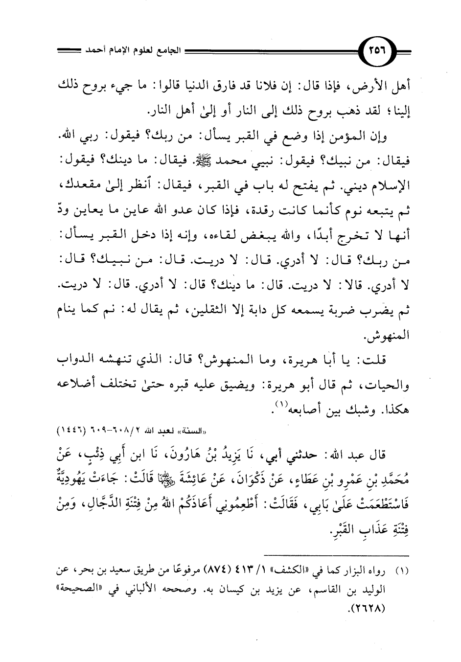 قال عبد اللَّه: حدثني أبي، نَا يَزِيدُ بْنُ هَارُونَ، نَا ابن أَبِي ذِئْبٍ، عَنْ مُحَمَّدِ بْنِ عَمْرِو بْنِ عَطَاءٍ، عَنْ ذَكْوَانَ، عَنْ عَائِشَةَ -رضي اللَّه عنه- قَالَتْ: جَاءَتْ يَهُودِيَّة فَاسْتَطْعَمَتْ عَلَى بَابِي، فَقَالَتْ: أَطْعِمُونِي أَعَاذَكُمْ اللَّهُ مِنْ فِتْنَةِ الدَّجَّالِ، وَمِنْ فِتْنَةِ عَذَابِ القَبْرِ.