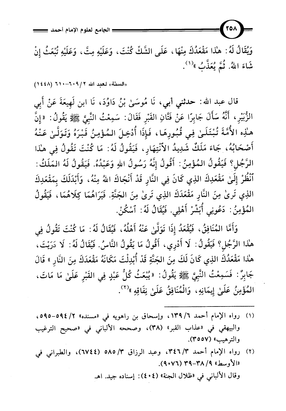 قال عبد اللَّه: حدثني أبي، نَا مُوسَى بْنُ دَاوُدَ، نَا ابن لَهِيعَةَ عَنْ أَبِي الزُّبَيْرِ، أَنَّهُ سَأَلَ جَابِرًا عَنْ فَتَّانِ القَبْرِ فَقَالَ: سَمِعْتُ النَّبِيَّ -صلى اللَّه عليه وسلم- يقُولُ: "إنَّ هذِه الأمَّةَ تُبْتَلَى فِي قُبُورِهَا، فَإِذَا أُدْخِلَ الْمُؤْمِنُ قَبْرَهُ وَتَوَلَّى عَنْهُ أَصْحَابُهُ، جَاءَ مَلَكٌ شَدِيدُ الِانْتِهَارِ، فَيَقُولُ لَهُ: مَا كُنْتَ تَقُولُ فِي هَذَا الرَّجُلِ؟ فَيَقُولُ الْمُؤْمِنُ: أَقُولُ إِنَّهُ رَسُولُ اللَّهِ وَعَبْدُهُ. فَيَقُولُ لَهُ الْمَلَكُ: انْظُرْ إِلَى مَقْعَدِكَ الَّذِي كَانَ لَكَ فِي النَّارِ قَدْ أَنْجَاكَ اللَّهُ مِنْهُ، وَأَبْدَلَكَ بِمَقْعَدِكَ الَّذِي تَرَى مِنَ النَّارِ مَقْعَدَكَ الَّذِي تَرَى مِنَ الْجَنَّةِ. فَيَرَاهُمَا كِلَاهُمَا، فَيَقُولُ الْمُؤْمِنُ: دَعُونِي أُبَشِّرْ أَهْلِي. فَيُقَالَ لَهُ: اسْكُنْ.