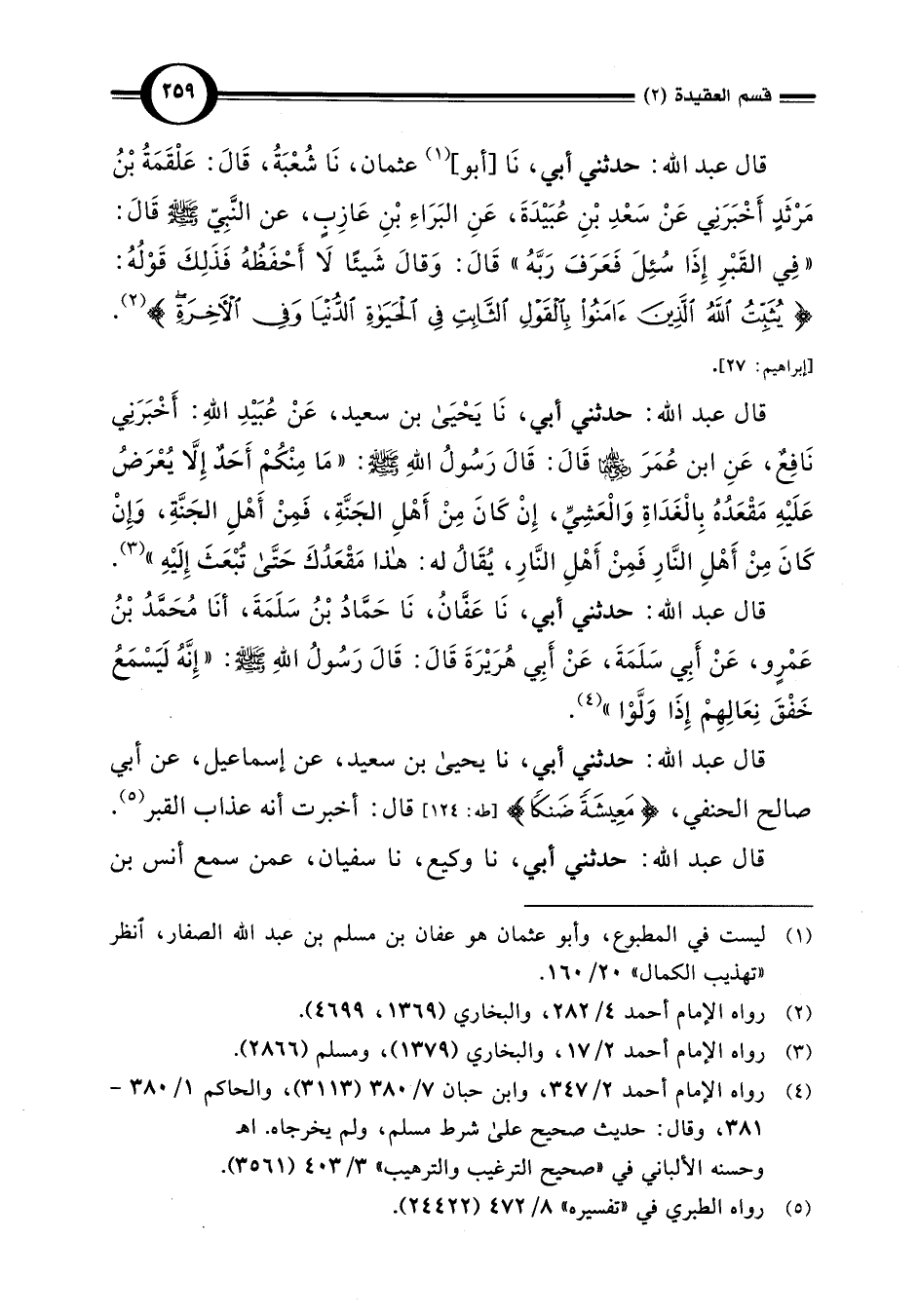قال عبد اللَّه: حدثني أبي، نَا يَحْيَى بن سعيد، عَنْ عُبَيْدِ اللَّهِ: أَخْبَرَنِي نَافِعٌ، عَنِ ابن عُمَرَ -رضي اللَّه عنهما- قَالَ: قَالَ رَسُولُ اللَّهِ صلى اللَّه عليه وسلم: "مَا مِنْكُمْ أَحَدٌ إِلَّا يُعْرَضُ عَلَيْهِ مَقْعَدُهُ بِالْغَدَاةِ وَالْعَشِيِّ، إِنْ كَانَ مِنْ أَهْلِ الجَنَّةِ، فَمِنْ أَهْلِ الجَنَّةِ، وَإِنْ كَانَ مِنْ أَهْلِ النَّارِ فَمِنْ أَهْلِ النَّارِ، يُقَالُ له: هذا مَقْعَدُكَ حَتَّى تُبْعَثَ إِلَيْهِ" (¬3).