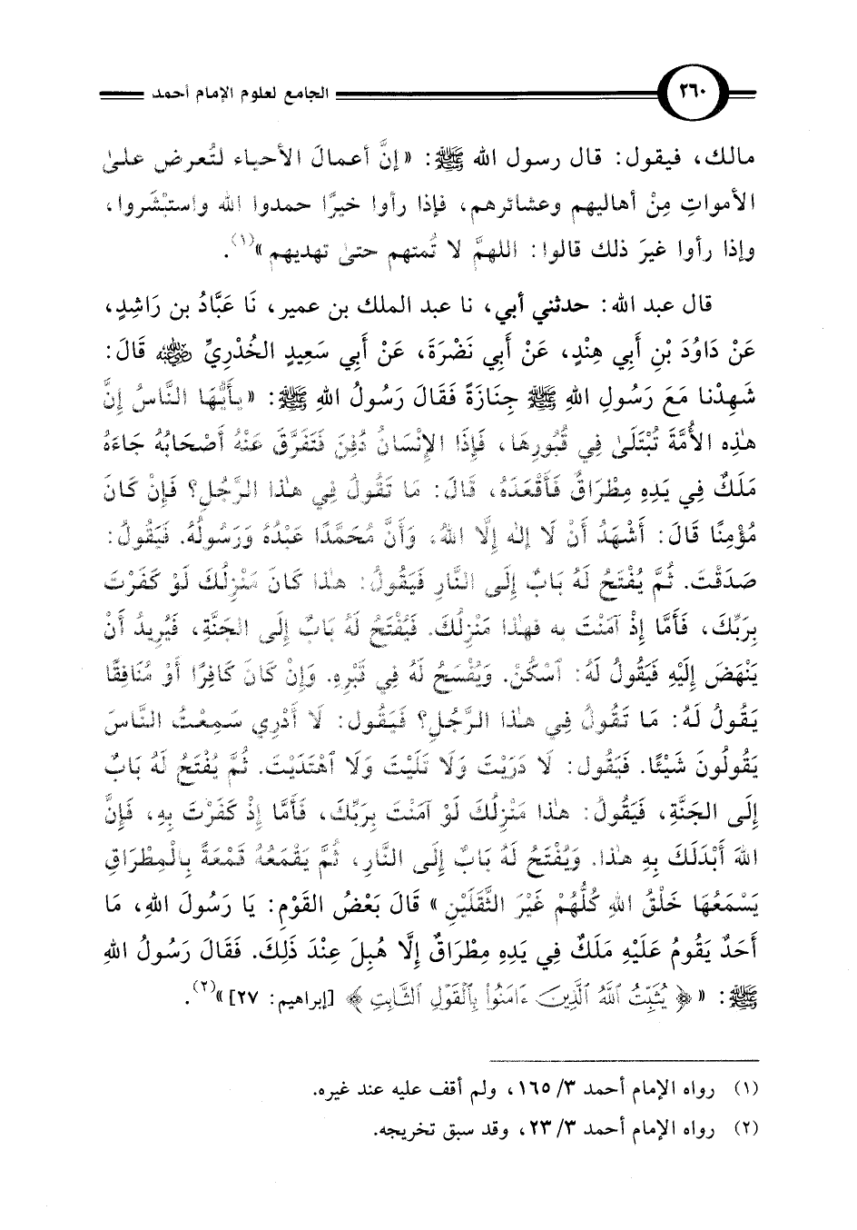 قال عبد اللَّه: حدثني أبي، نا عبد الملك بن عمير، نَا عَبَّادُ بن رَاشِدٍ، عن داود بنِ أبِي هِندٍ، عَنْ أبِي نضرَة، عَنْ أبِي سَعِيدٍ الخدْرِيَ -رضي اللَّه عنه- قَالَ: شَهِدْنَا مَعَ رَسُولِ اللَّهِ -صلى اللَّه عليه وسلم- جِنَارةً فَقَالَ رَسُولُ اللَّهِ صَلَّى اللَّهُ عَلَيْهِ وَسَلَّمَ: "أَيُّهَا النَّاسُ إِنَّ هَذِهِ الْأُمَّةَ تُبْتَلَى فِي قُبُورِهَا، فَإِذَا الْإِنْسَانُ دُفِنَ فَتَفَرَّقَ عَنْهُ أَصْحَابُهُ جَاءَهُ مَلَكٌ فِي يَدِهِ مِطْرَاقٌ فَأَقْعَدَهُ، قَالَ: مَا تَقُولُ فِي هَذَا الرَّجُلِ؟ فَإِنْ كَانَ مُؤْمِنًا قَالَ: أَشْهَدُ أَنْ لَا إِلَهَ إِلَّا اللَّهُ، وَأَنَّ مُحَمَّدًا عَبْدُهُ وَرَسُولُهُ. فَيَقُولُ: صَدَقْتَ. ثُمَّ يُفْتَحُ لَهُ بَابٌ إِلَى النَّارِ فَيَقُولُ: هَذَا كَانَ مَنْزِلُكَ لَوْ كَفَرْتَ بِرَبِّكَ، فَأَمَّا إِذْ آمَنْتَ بهِ فَهَذَا مَنْزِلُكَ. فَيُفْتَحُ لَهُ بَابٌ إِلَى الْجَنَّةِ، فَيُرِيدُ أَنْ يَنْهَضَ إِلَيْهِ فَيَقُولُ لَهُ: اسْكُنْ وَيُفْسَحُ لَهُ فِي قَبْرِهِ، وَإِنْ كَانَ كَافِرًا أَوْ مُنَافِقًا يَقُولُ لَهُ: مَا تَقُولُ فِي هَذَا الرَّجُلِ؟ فَيَقُولَ: لَا أَدْرِي سَمِعْتُ النَّاسَ يَقُولُونَ شَيْئًا. فَيَقُولُ: لَا دَرَيْتَ وَلَا تَلَيْتَ وَلَا اهْتَدَيْتَ. ثُمَّ يُفْتَحُ لَهُ بَابٌ إِلَى الْجَنَّةِ، فَيَقُولُ: هَذَا مَنْزِلُكَ لَوْ آمَنْتَ بِرَبِّكَ، فَأَمَّا إِذْ كَفَرْتَ بِهِ، فَإِنَّ اللَّهَ عَزَّ وَجَلَّ أَبْدَلَكَ بِهِ هَذَا. وَيُفْتَحُ لَهُ بَابٌ إِلَى النَّارِ، ثُمَّ يَقْمَعُهُ قَمْعَةً بِالْمِطْرَاقِ يَسْمَعُهَا خَلْقُ اللَّهِ كُلُّهُمْ غَيْرَ الثَّقَلَيْنِ" فَقَالَ بَعْضُ الْقَوْمِ: يَا رَسُولَ اللَّهِ، مَا أَحَدٌ يَقُومُ عَلَيْهِ مَلَكٌ فِي يَدِهِ مِطْرَاقٌ إِلَّا هُبِلَ عِنْدَ ذَلِكَ، فَقَالَ رَسُولُ اللَّهِ صَلَّى اللَّهُ عَلَيْهِ وَسَلَّمَ: " {يُثَبِّتُ اللَّهُ الَّذِينَ آمَنُوا بِالْقَوْلِ الثَّابِتِ} " [إبراهيم: 27] (¬2).