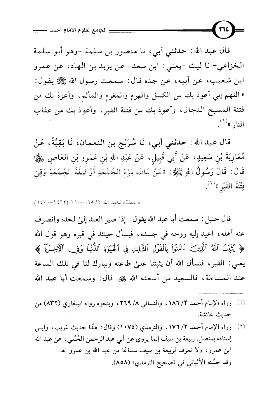 قال عبد اللَّه: حدثني أبي، نَا سُرَيْج بن النعمان، نَا بَقِيَّةُ، عَنْ مُعَاوِيةَ بْنِ سَعِيدٍ، عَنْ أَبِي قَبِيلٍ، عَنْ عَبْدِ اللَّهِ بْنِ عَمْرِو بْنِ العَاصِ -رضي اللَّه عنهما- قَالَ: قَالَ رَسُولُ اللَّهِ صلى اللَّه عليه وسلم: "مَنْ مَاتَ يَوْمَ الجُمْعَةِ أَوْ لَيلَةَ الجُمُعَةِ وُقِيَ فِتْنَةَ القَبْرِ" (¬2).