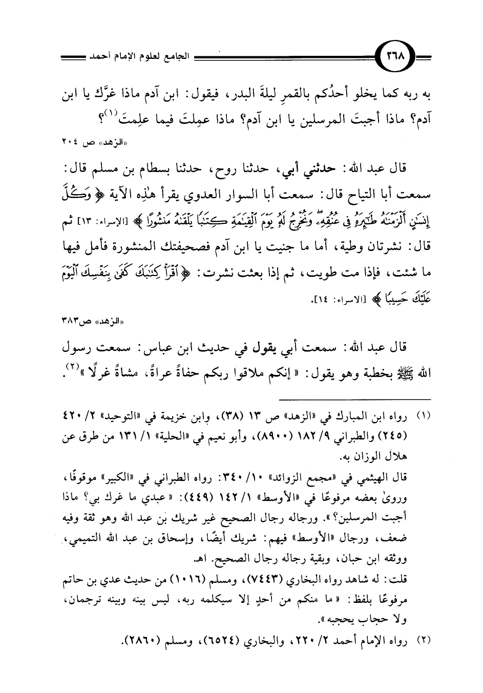 قال عبد اللَّه: سمعت أبي يقول في حديث ابن عباس: سمعت رسول اللَّه -صلى اللَّه عليه وسلم- بخطبة وهو يقول: "إنكم ملاقوا ربكم حفاةً عرأَةً، مشاةً غرلًا" (¬2).