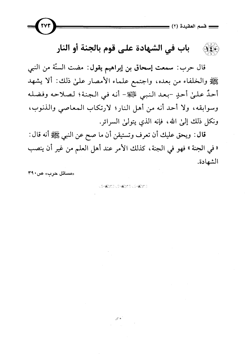 قال حرب: سمعت إسحاق بن إبراهيم يقول: مضت السنّة من النبي -صلى اللَّه عليه وسلم- والخلفاء من بعده، واجتمع علماء الأمصار على ذلك: ألا يشهد أحذ على أحدٍ -بعد النبي -صلى اللَّه عليه وسلم- أنه في الجنة؛ لصلاحه وفضله وسوابقه، ولا أحد أنه من أهل النار؛ لارتكاب المعاصي والذنوب، ونكل ذلك إلى اللَّه، فإنه الذي يتولى السرائر.