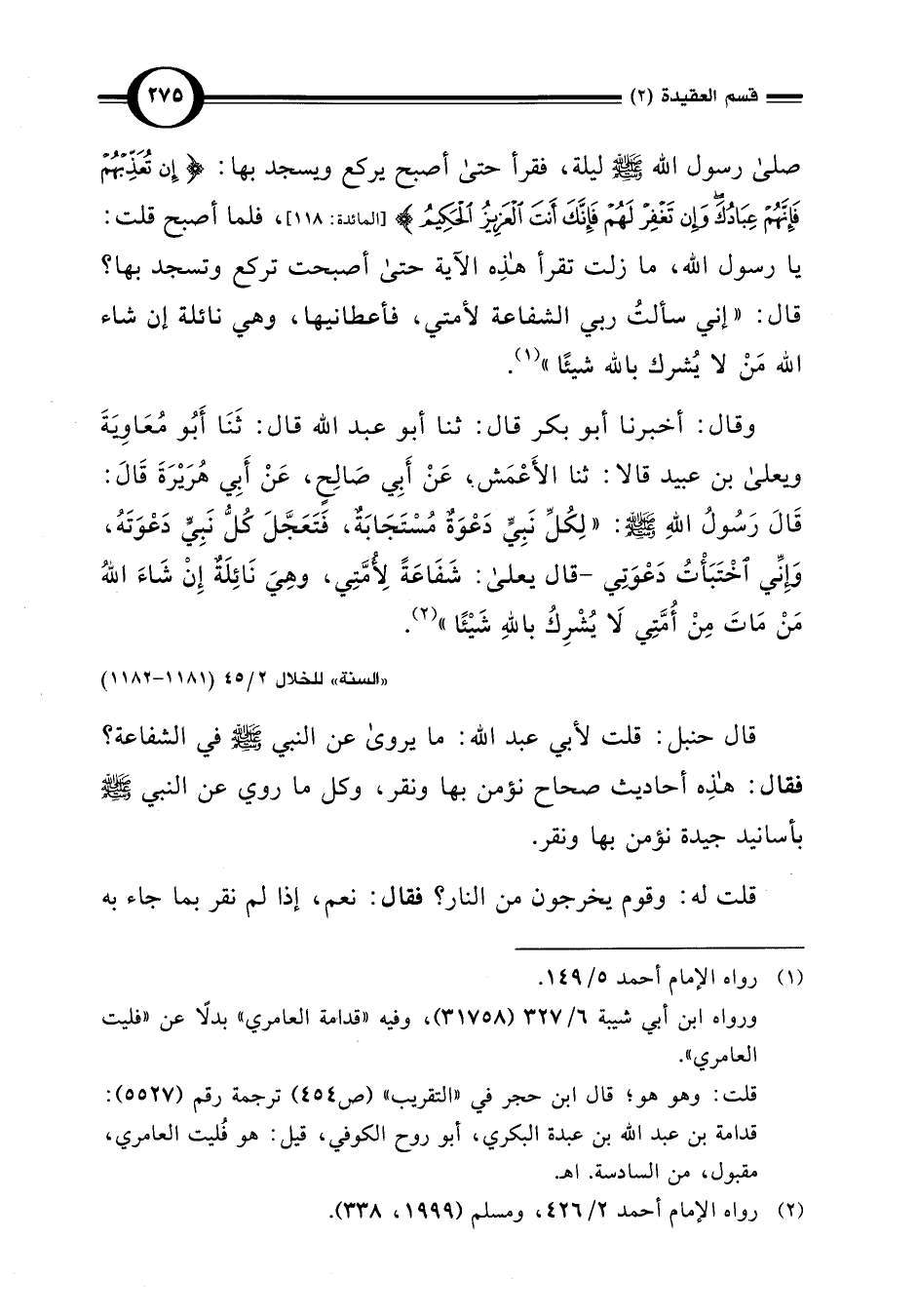 قال حنبل: قلت لأبي عبد اللَّه: ما يروى عن النبي -صلى اللَّه عليه وسلم- في الشفاعة؟ فقال: هذِه أحاديث صحاح نؤمن بها ونقر، وكل ما روي عن النبي -صلى اللَّه عليه وسلم- بأسانيد جيدة نؤمن بها ونقر.