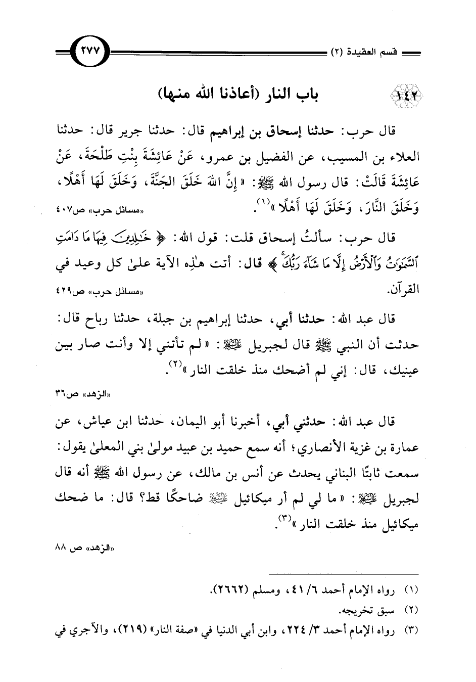 قال حرب: حدثنا إسحاق بن إبراهيم قال: حدثنا جرير قال: حدثنا العلاء بن المسيب، عن الفضيل بن عمرو، عَنْ عَائِشَةَ بِنْتِ طَلْحَةَ، عَنْ عَائِشَةَ قَالَتْ: قال رسول اللَّه -صلى اللَّه عليه وسلم-: "إِنَّ اللَّهَ خَلَقَ الجَنَّةَ، وَخَلَقَ لَهَا أَهْلًا، وَخَلَقَ النَّارَ، وَخَلَقَ لَهَا أَهْلًا" (¬1).