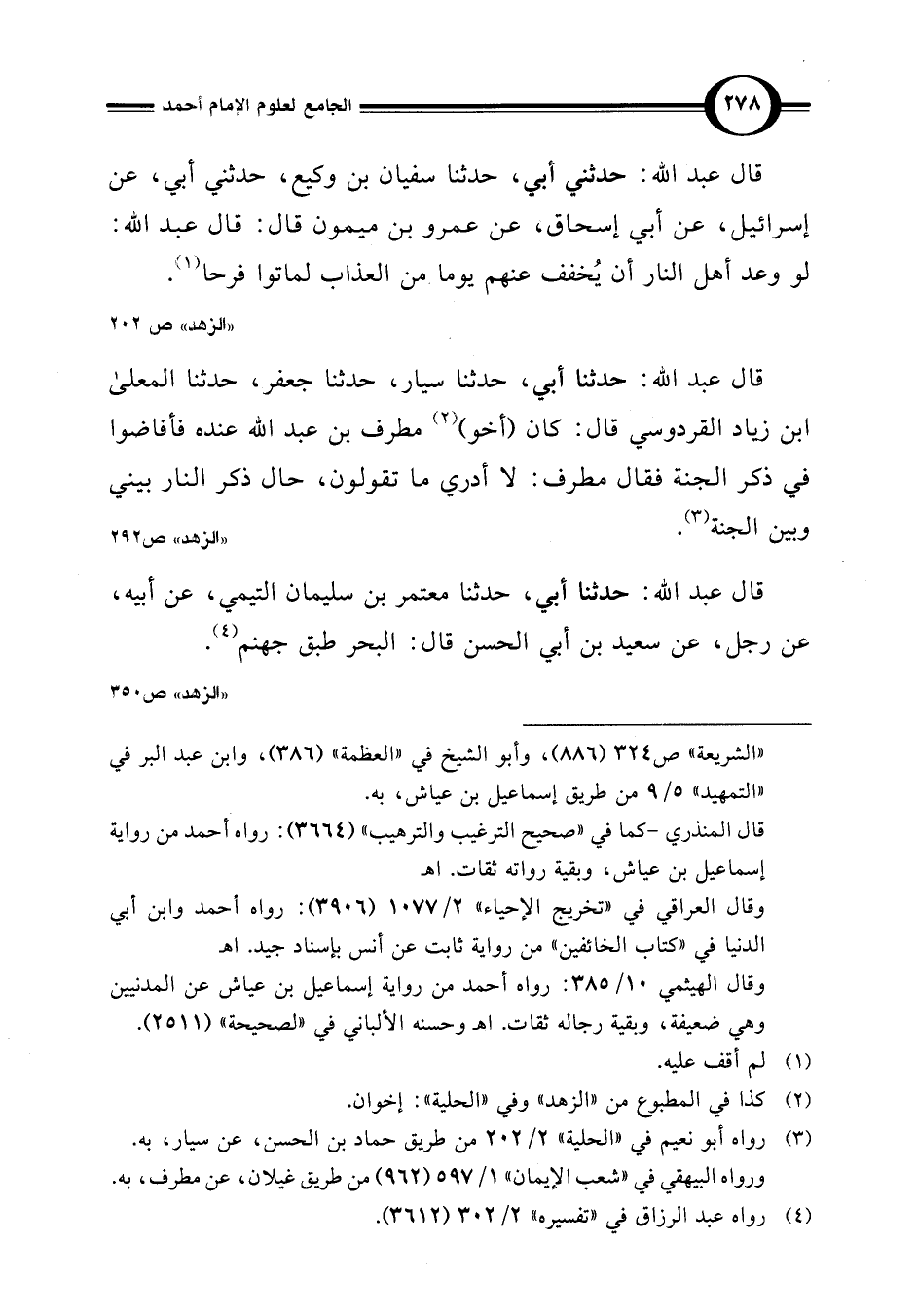 قال عبد اللَّه: حدثني أبي، حدثنا سفيان بن وكيع، حدثني أبي، عن إسرائيل، عن أبي إسحاق، عن عمرو بن ميمون قال: قال عبد اللَّه: لو وعد أهل النار أن يُخفف عنهم يوما من العذاب لماتوا فرحا (¬1).