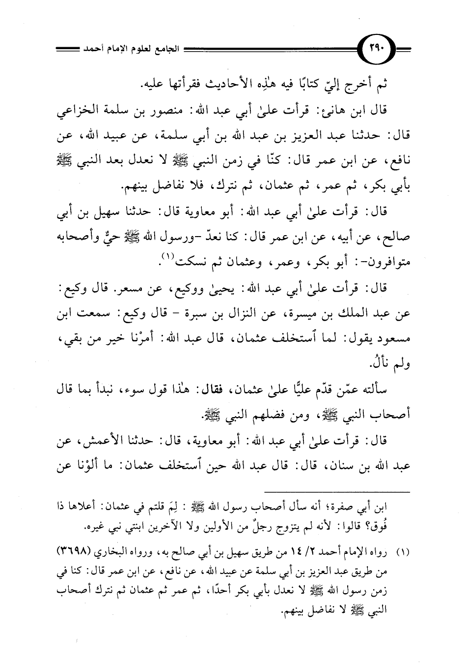 قال: قرأت على أبي عبد اللَّه: أبو معاوية قال: حدثنا سهيل بن أبي صالح، عن أبيه، عن ابن عمر قال: كنا نعدّ -ورسول اللَّه -صلى اللَّه عليه وسلم- حيٌّ وأصحابه متوافرون-: أبو بكر، وعمر، وعثمان ثم نسكت (¬1).