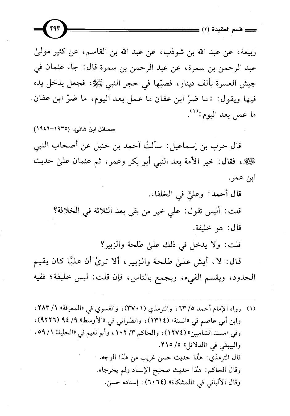 قال حرب بن إسماعيل: سألتُ أحمد بن حنبل عن أصحاب النبي -صلى اللَّه عليه وسلم-، فقال: خير الأمة بعد النبي أبو بكر وعمر، ثم عثمان على حديث ابن عمر.