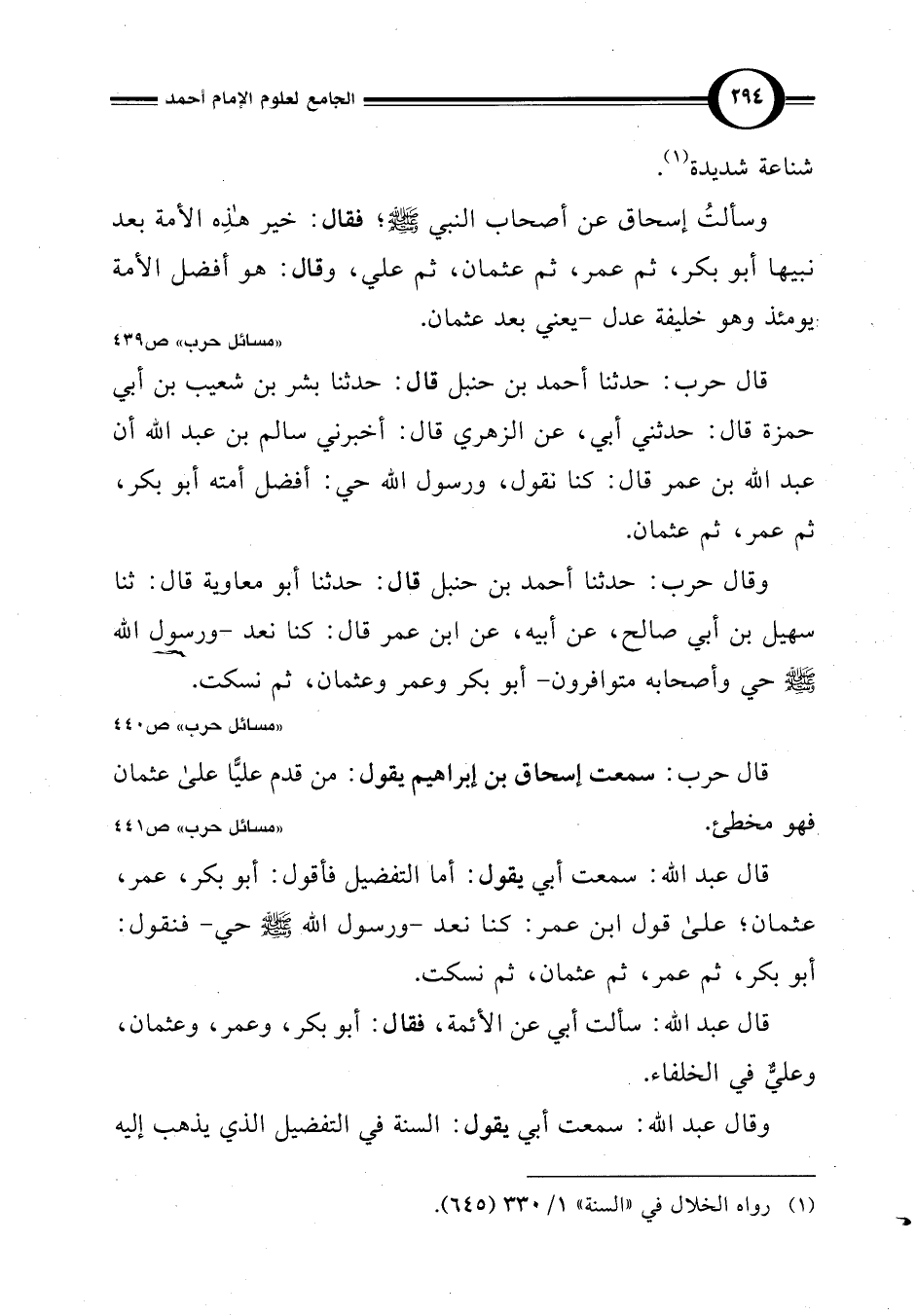 وقال حرب: حدثنا أحمد بن حنبل قال: حدثنا أبو معاوية قال: ثنا سهيل بن أبي صالح، عن أبيه، عن ابن عمر قال: كنا نعد -ورسول اللَّه حي وأصحابه متوافرون- أبو بكر وعمر وعثمان، ثم نسكت.