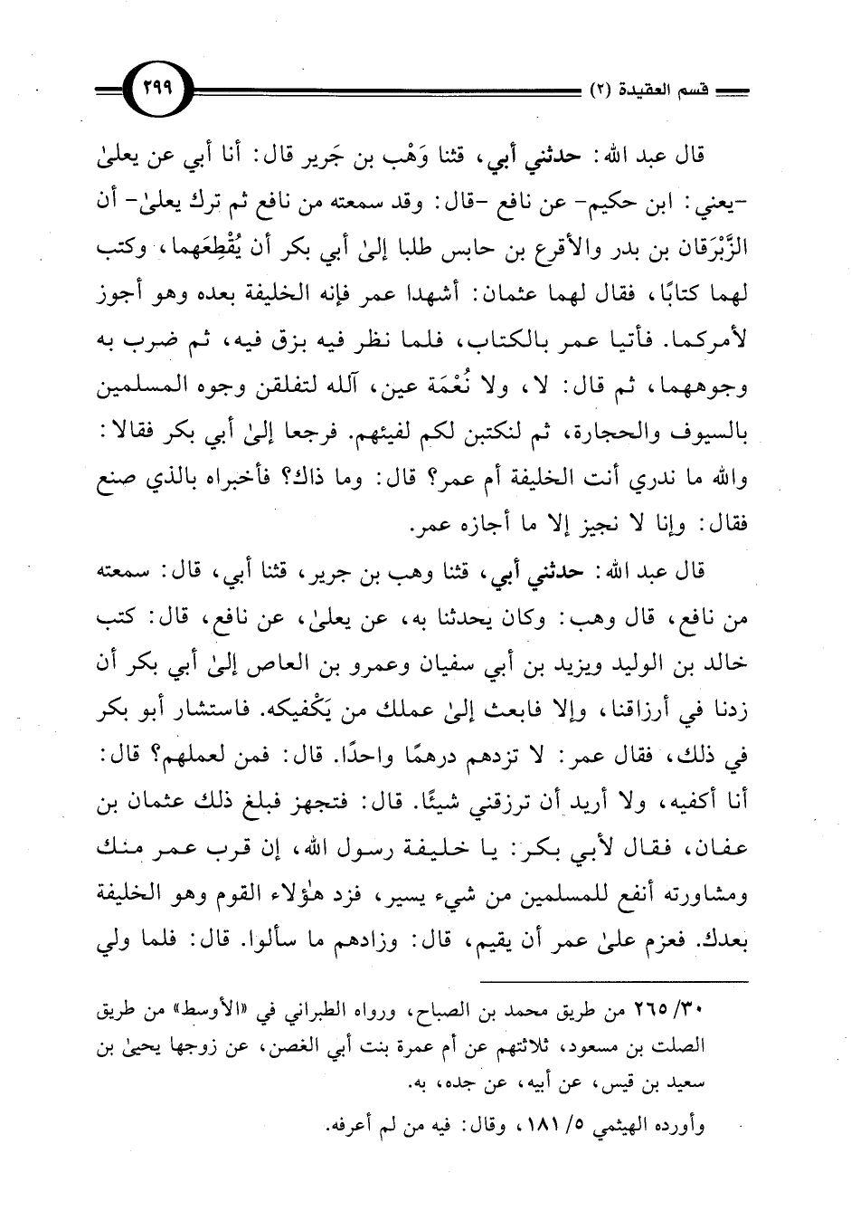 قال عبد اللَّه: حدثني أبي، قثنا وَهْب بن جَرير قال: أنا أبي عن يعلى -يعني: ابن حكيم- عن نافع -قال: وقد سمعته من نافع ثم ترك يعلى- أن الزَّبْرَقان بن بدر والأقرع بن حابس طلبا إلى أبي بكر أن يُقْطِعَهما، وكتب لهما كتابًا، فقال لهما عثمان: أشهدا عمر فإنه الخليفة بعده وهو أجوز لأمركما. فأتيا عمر بالكتاب، فلما نظر فيه بزق فيه، ثم ضرب به وجوههما، ثم قال: لا، ولا نُعْمَة عين، اللَّه لتفلقن وجوه المسلمين بالسيوف والحجارة، ثم لنكتبن لكم لفيئهم. فرجعا إلى أبي بكر فقالا: واللَّه ما ندري أنت الخليفة أم عمر؟ قال: وما ذاك؟ فأخبراه بالذي صنع فقال: وإنا لا نجيز إلا ما أجازه عمر.