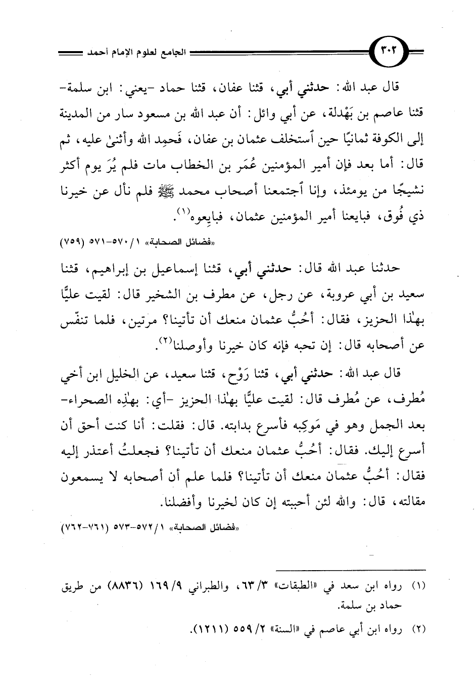 قال عبد اللَّه: حدثني أبي، قثنا رَوْح، قثنا سعيد، عن الخليل ابن أخي مُطرف، عن مُطرف قال: لقيت عليًّا بهذا الحزيز -أي: بهذِه الصحراء- بعد الجمل وهو في مَوكِبه فأسرع بدابته. قال: فقلت: أنا كنت أحق أن أسرع إليك. فقال: أحُبُّ عثمان منعك أن تأتينا؟ فجعلتُ أعتذر إليه فقال: أحُبُّ عثمان منعك أن تأتينا؟ فلما علم أن أصحابه لا يسمعون مقالته، قال: واللَّه لئن أحببته إن كان لخيرنا وأفضلنا.