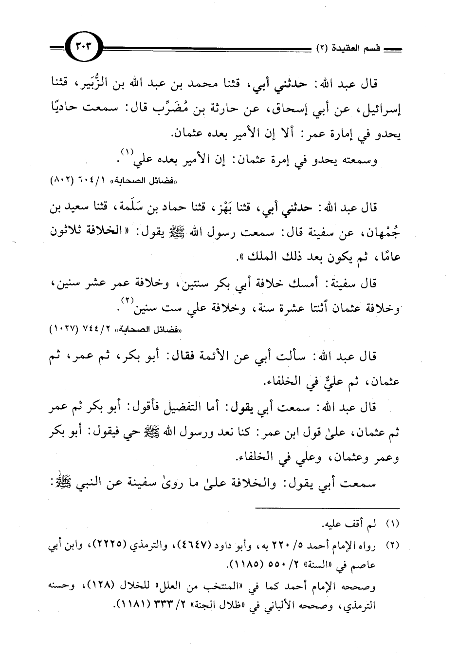 قال عبد اللَّه: سألت أبي عن الأئمة فقال: أبو بكر، ثم عمر، ثم عثمان، ثم عليٌّ في الخلفاء.