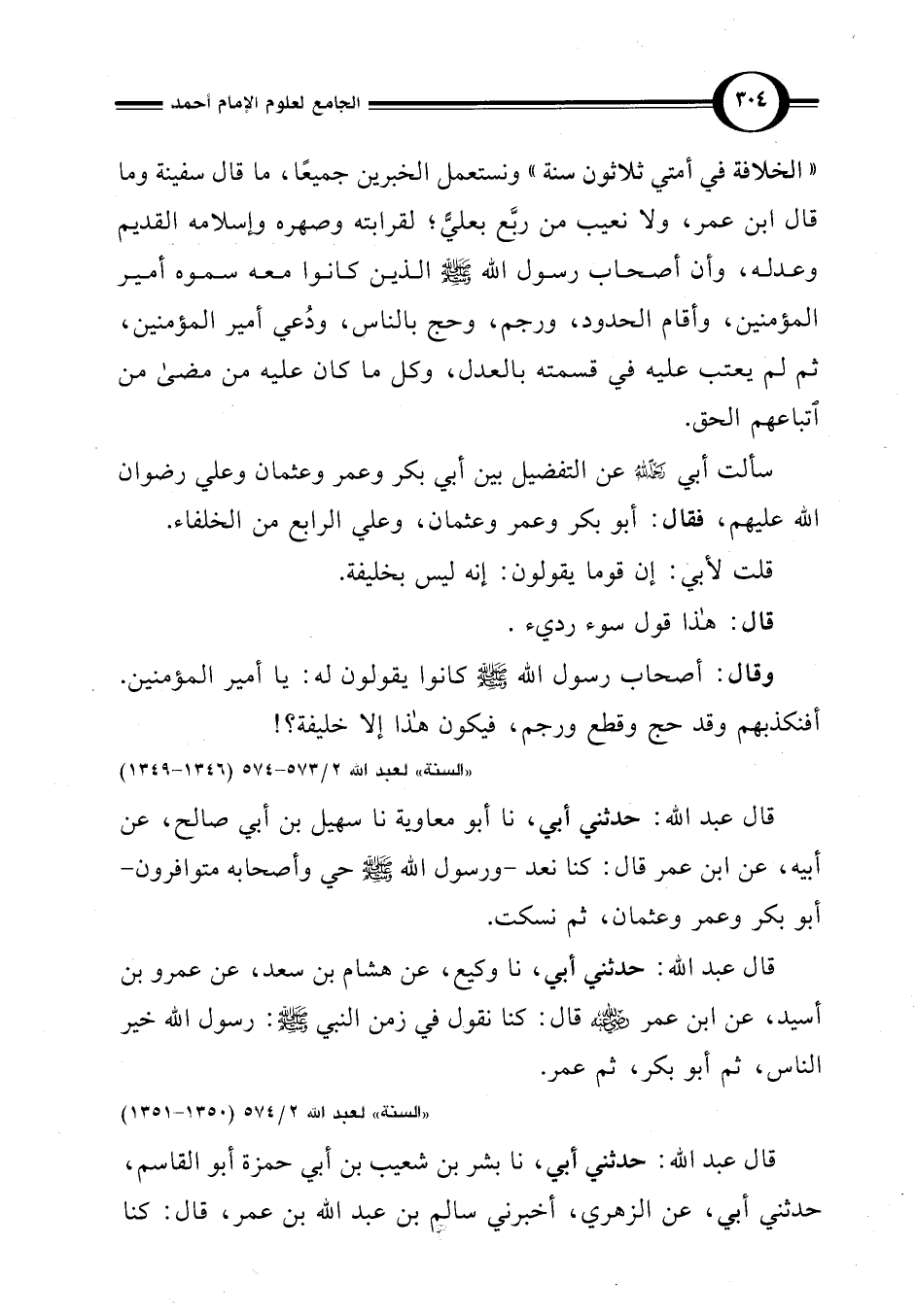 قال عبد اللَّه: حدثني أبي، ثا أبو معاوية نا سهيل بن أبي صالح، عن أبيه، عن ابن عمر قال: كنا نعد -ورسول اللَّه -صلى اللَّه عليه وسلم- حي وأصحابه متوافرون- أبو بكر وعمر وعثمان، ثم نسكت.