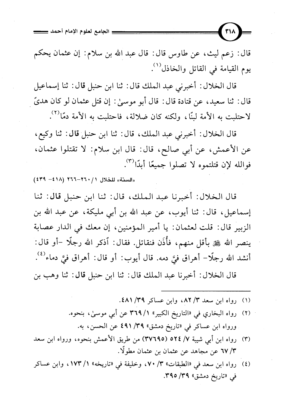 قال الخلال: أخبرني عبد الملك، قال: ثنا ابن حنبل قال: ثنا وكيع، عن الأعمش، عن أبي صالح، قال: قال ابن سلام: لا تقتلوا عثمان، فواللَّه لإن قتلتموه لا تصلوا جميعًا أبدًا (¬3).