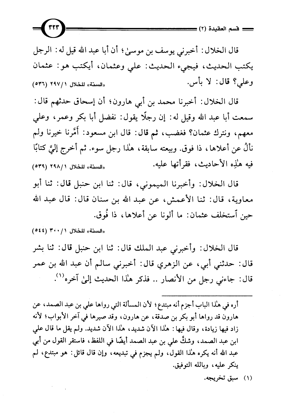 قال الخلال: وأخبرنا الميموني، قال: ثنا ابن حنبل قال: ثنا أبو معاوية، قال: ثنا الأعمش، عن عبد اللَّه بن سنان قال: قال عبد اللَّه حين استخلف عثمان: ما ألونا عن أعلاها، ذا فُوق.