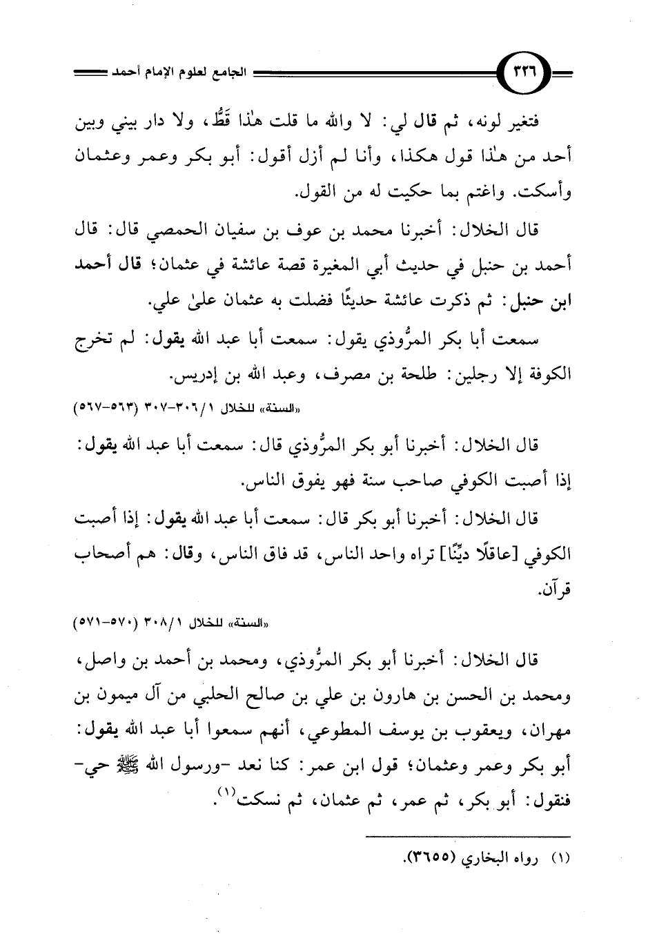 قال الخلال: أخبرنا أبو بكر المرُّوذي، ومحمد بن أحمد بن واصل، ومحمد بن الحسن بن هارون بن علي بن صالح الحلبي من آل ميمون بن مهران، ويعقوب بن يوسف المطوعي، أنهم سمعوا أبا عبد اللَّه يقول: أبو بكر وعمر وعثمان؛ قول ابن عمر: كنا نعد -ورسول اللَّه -صلى اللَّه عليه وسلم- حي- فنقول: أبو بكر، ثم عمر، ثم عثمان، ثم نسكت (¬1).