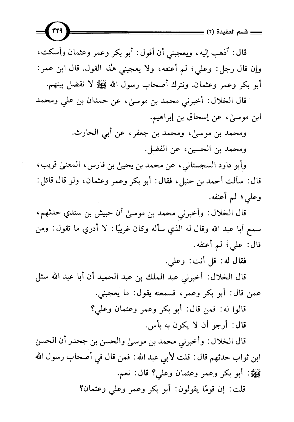 قال الخلال: وأخبرني محمد بن موسى والحسن بن جحدر أن الحسن ابن ثواب حدثهم قال: قلت لأبي عبد اللَّه: فمن قال في أصحاب رسول اللَّه -صلى اللَّه عليه وسلم-: أبو بكر وعمر وعثمان وعلي؟ قال: نعم.