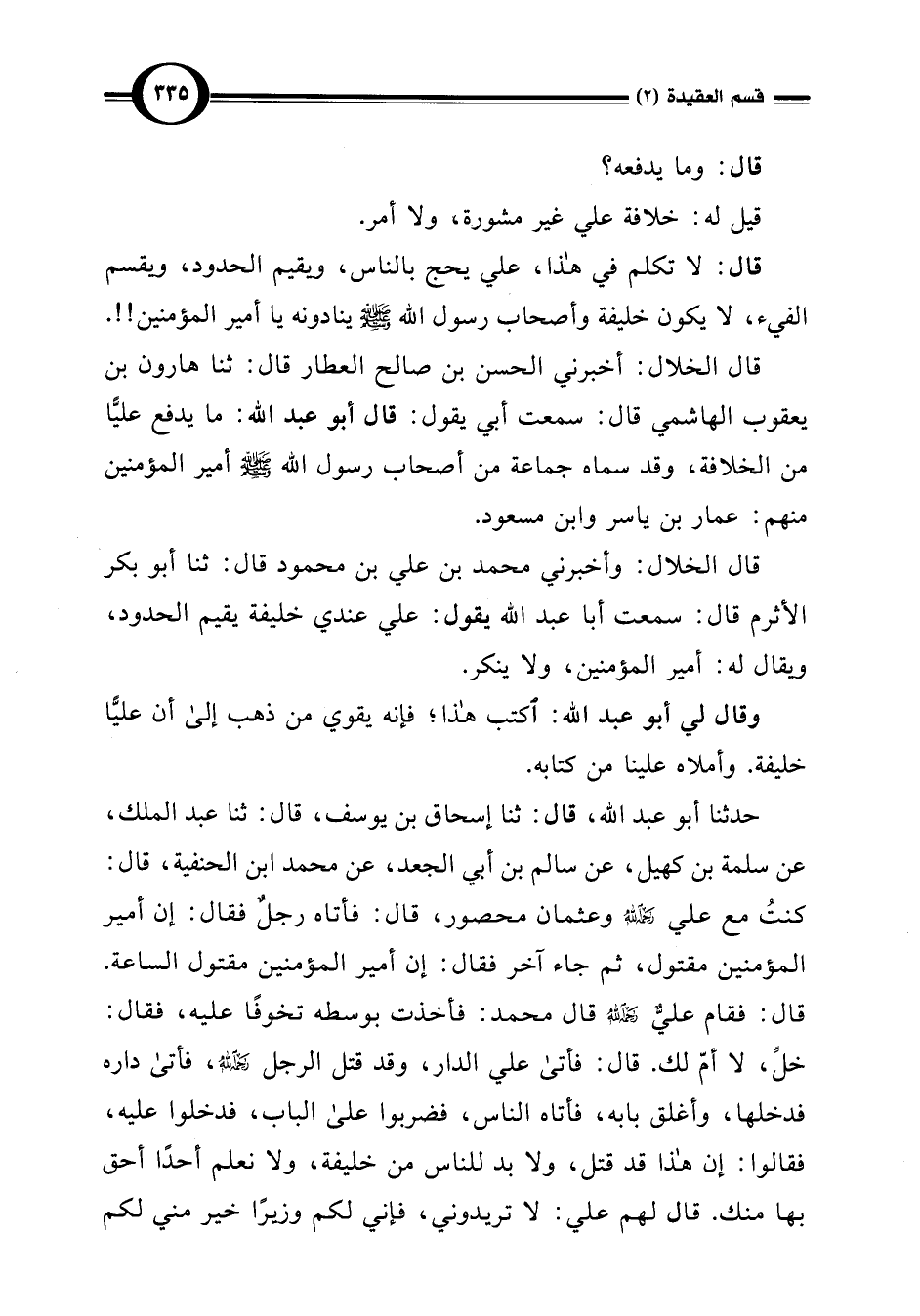 قال الخلال: أخبرني الحسن بن صالح العطار قال: ثنا هارون بن يعقوب الهاشمي قال: سمعت أبي يقول: قال أبو عبد اللَّه: ما يدفع علئا من الخلافة، وقد سماه جماعة من أصحاب رسول اللَّه -صلى اللَّه عليه وسلم- أمير المؤمنين منهم: عمار بن ياسر وابن مسعود.