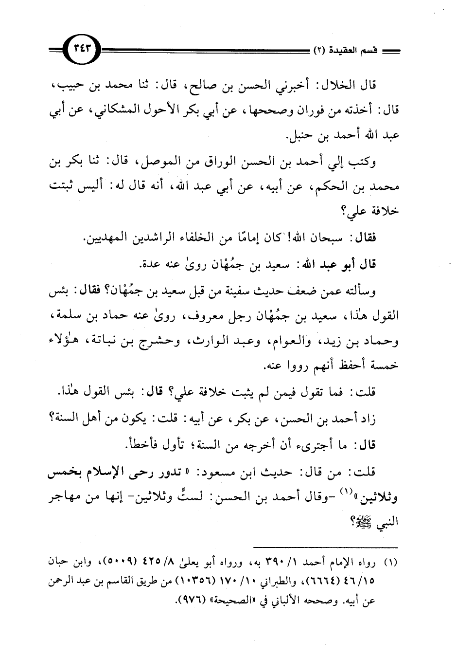 قال الخلال: أخبرني الحسن بن صالح، قال: ثنا محمد بن حبيب، قال: أخذته من فوران وصححها، عن أبي بكر الأحول المشكاني، عن أبي عبد اللَّه أحمد بن حنبل.