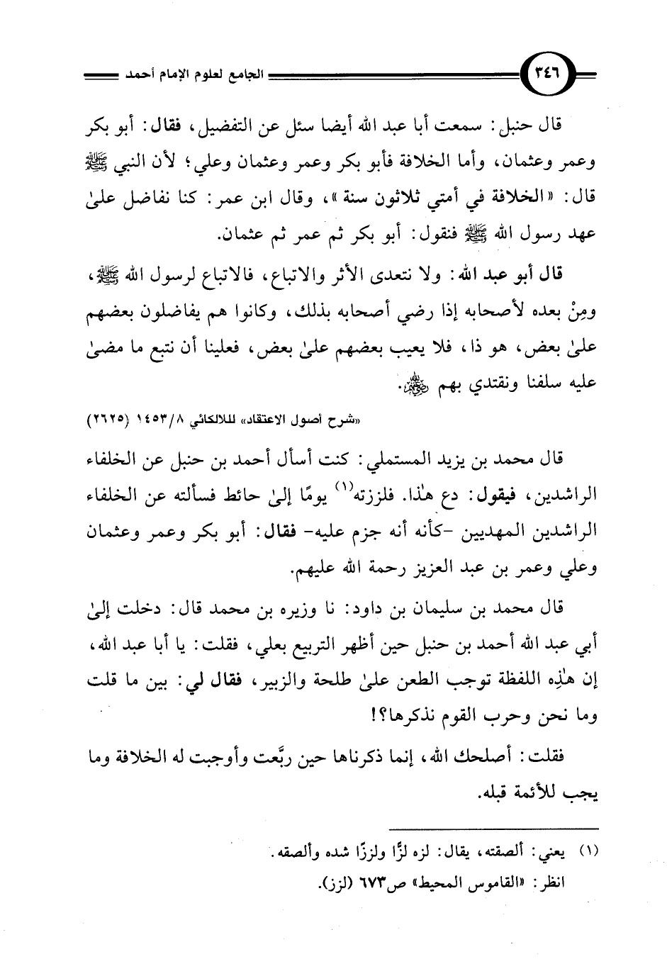 قال محمد بن سليمان بن داود: نا وزيره بن محمد قال: دخلت إلى أبي عبد اللَّه أحمد بن حنبل حين أظهر التربيع بعلي، فقلت: يا أبا عبد اللَّه، إن هذِه اللفظة توجب الطعن على طلحة والزبير، فقال لي: بين ما قلت وما نحن وحرب القوم نذكرها؟ !
