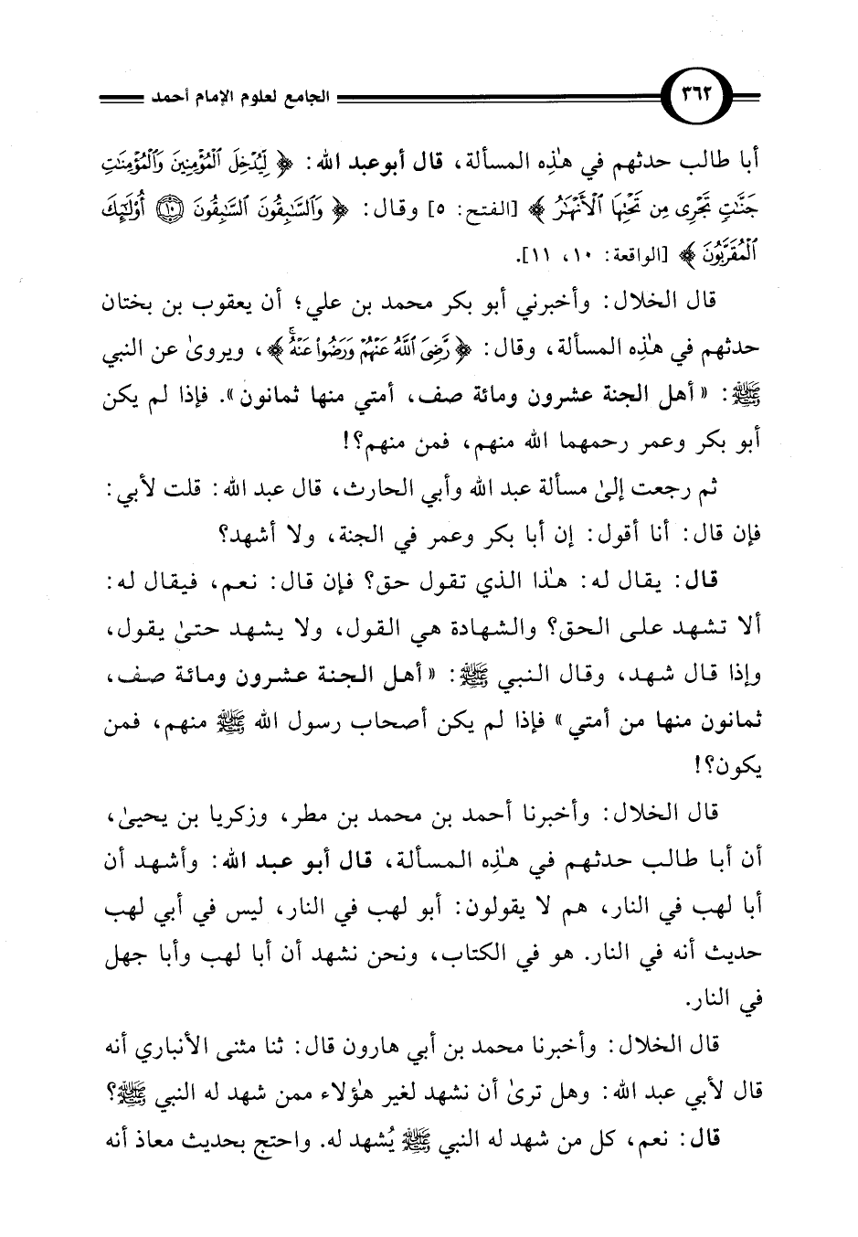 قال الخلال: وأخبرني أبو بكر محمد بن علي؛ أن يعقوب بن بختان حدثهم في هذِه المسألة، وقال: {رَضِيَ اللَّهُ عَنْهُمْ وَرَضُوا عَنْهُ}، ويروى عن النبي -صلى اللَّه عليه وسلم-: "أهل الجنة عشرون ومائة صف، أمتي منها ثمانون". فإذا لم يكن أبو بكر وعمر رحمهما اللَّه منهم، فمن منهم؟ !