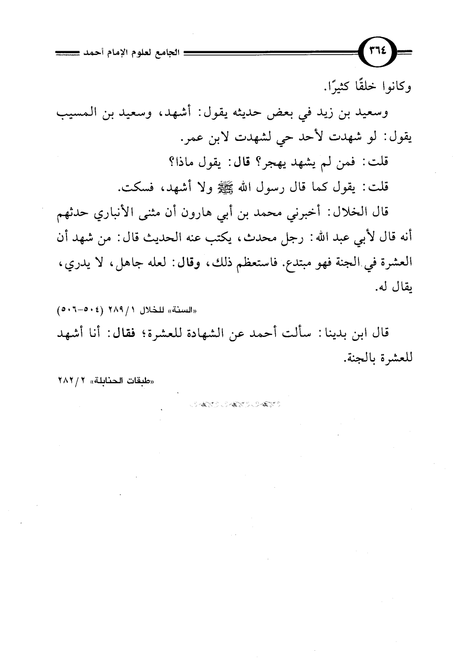 قال الخلال: أخبرني محمد بن أبي هارون أن مثنى الأنباري حدثهم أنه قال لأبي عبد اللَّه: رجل محدث، يكتب عنه الحديث قال: من شهد أن العشرة في الجنة فهو مبتدع. فاستعظم ذلك، وقال: لعله جاهل، لا يدري، يقال له.