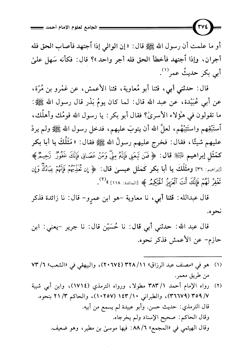 قال: حدثني أبي، قثنا أبو مُعاوية، قثنا الأعمش، عن عَمْرو بن مُرّة، عن أبي عُبَيْدة، عن عبد اللَّه قال: لما كان يومُ بَدْر قال رسول اللَّه -صلى اللَّه عليه وسلم-: ما تقولون في هؤلاء الأسرى؟ فقال أبو بكر: يا رسول اللَّه قومُك وأهلُك، استَبْقِهم واستَتِبْهُم، لعلَّ اللَّه أن يتوبَ عليهم، فدخل رسول اللَّه -صلى اللَّه عليه وسلم- ولم يردّ عليهم شيئًا، فقال: فخرج عليهم رسولُ اللَّه -صلى اللَّه عليه وسلم- فقال: "مَثلُكَ يا أبا بكر كَمَثَلِ إبراهيم عليه السلام قال: {فَمَنْ تَبِعَنِي فَإِنَّهُ مِنِّي وَمَنْ عَصَانِي فَإِنَّكَ غَفُورٌ رَحِيمٌ (36)} [إبراهيم: 36] ومثْلُكَ يا أبا بكر كمَثَل عيسى قال: {إِنْ تُعَذِّبْهُمْ فَإِنَّهُمْ عِبَادُكَ وَإِنْ تَغْفِرْ لَهُمْ فَإِنَّكَ أَنْتَ الْعَزِيزُ الْحَكِيمُ (118)} [المائدة: 118] (¬2).