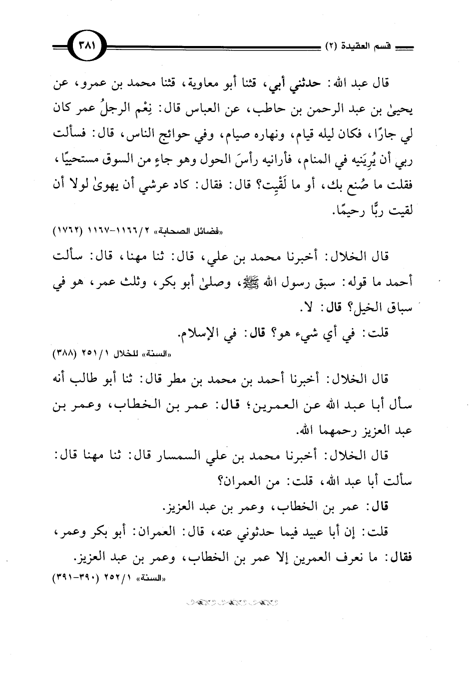 قال الخلال: أخبرنا أحمد بن محمد بن مطر قال: ثنا أبو طالب أنه سأل أبا عبد اللَّه عن العمرين؛ قال: عمر بن الخطاب، وعمر بن عبد العزيز رحمهما اللَّه.
