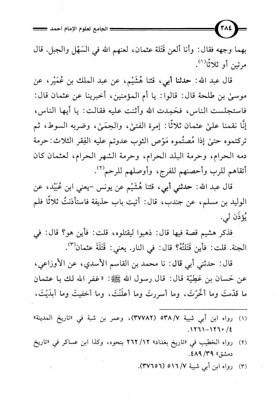 قال عبد اللَّه: حدثنا أبي، قثنا هُشَيْم، عن عبد الملك بن عُمَيْر، عن موسى بن طلحة قال: قالوا: يا أم المؤمنين، أخبرينا عن عثمان قال: فاستجلست الناس، فحَمِدت اللَّه وأثنت عليه فقالت: يا أيها الناس، إنَّا نقمنا على عثمان ثلاثًا: إمرة الفتى، والحِمَى، وضربه السوط، ثم تركتموه حتى إذا مُصتُموه مَوْص الثوب عدوتم عليه الفِقر الثلاث: حرمة دمه الحرام، وحرمة البلد الحرام، وحرمة الشهر الحرام، لعثمان كان أتقاهم للرب وأحصنهم للفرج، وأوصلهم للرحم (¬2).
