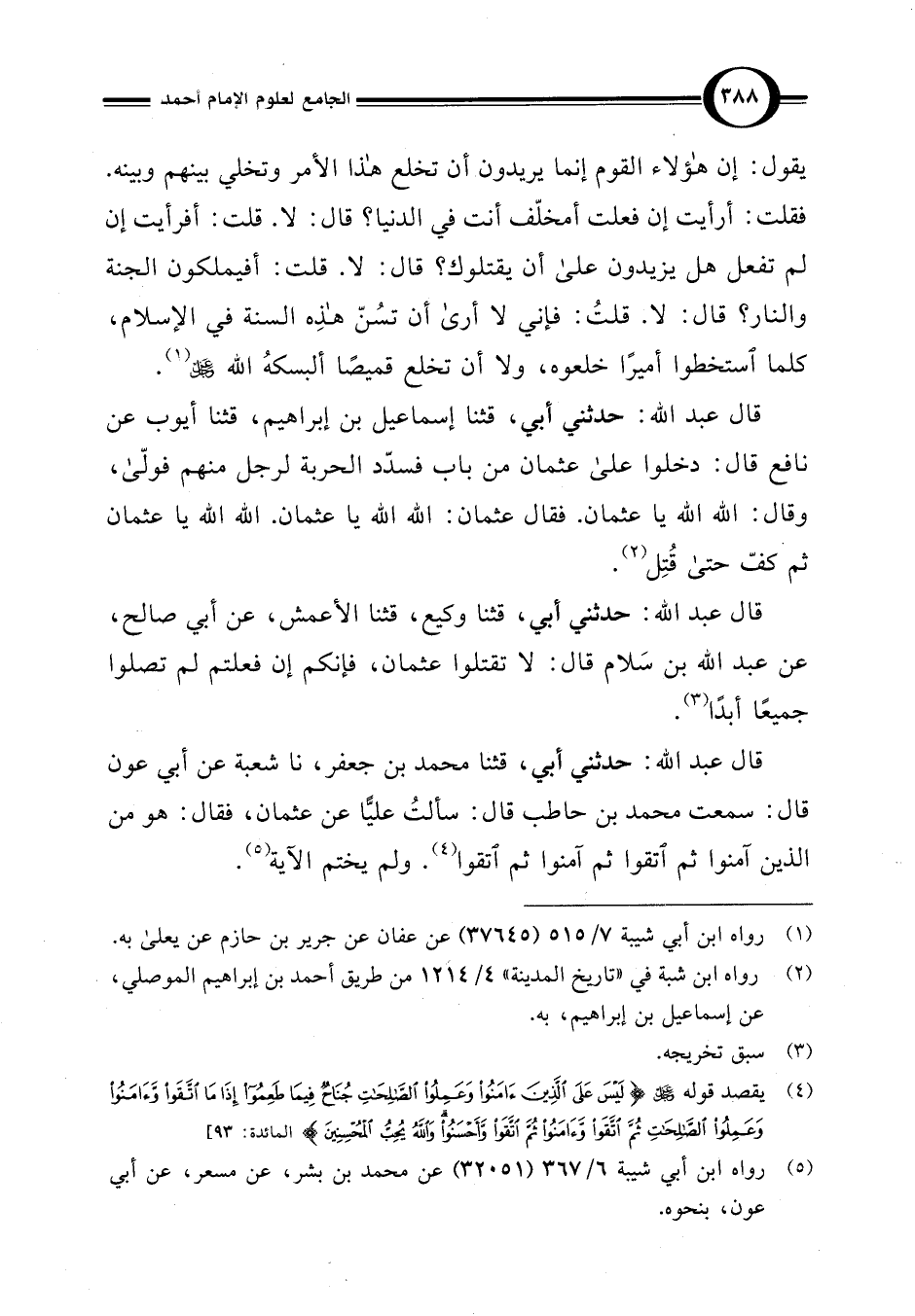 قال عبد اللَّه: حدثني أبي، قثنا محمد بن جعفر، نا شعبة عن أبي عون قال: سمعت محمد بن حاطب قال: سألتُ عليًّا عن عثمان، فقال: هو من الذين آمنوا ثم اتقوا ثم آمنوا ثم اتقوا (¬4). ولم يختم الآية (¬5).
