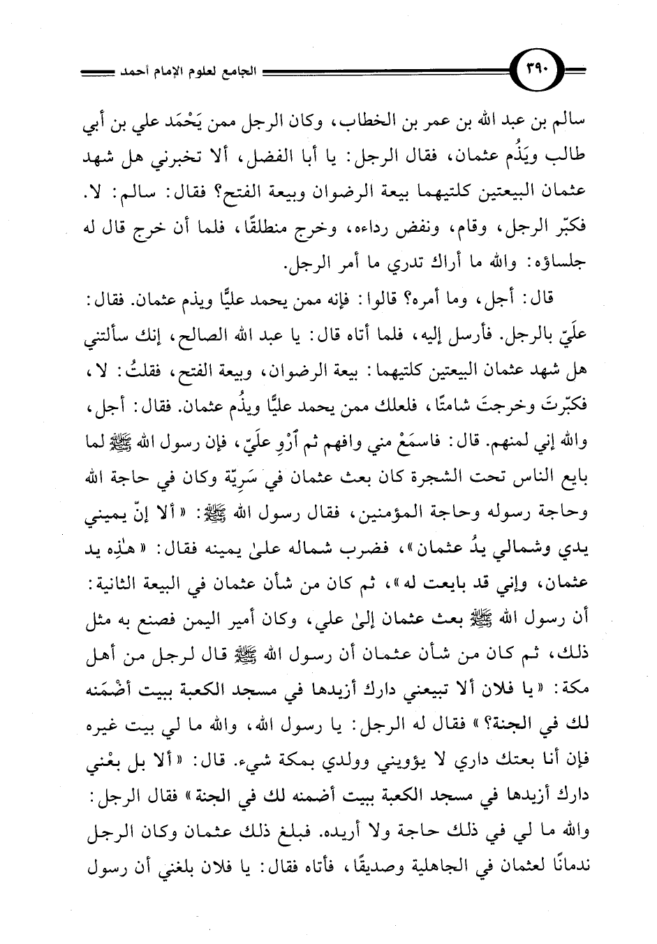 قال: أجل، وما أمره؟ قالوا: فإنه ممن يحمد عليًّا ويذم عثمان. فقال: علَيّ بالرجل. فأرسل إليه، فلما أتاه قال: يا عبد اللَّه الصالح، إنك سألتني هل شهد عثمان البيعتين كلتيهما: بيعة الرضوان، وبيعة الفتح، فقلتُ: لا، فكبّرتَ وخرجتَ شاميًا، فلعلك ممن يحمد عليًّا ويذُم عثمان. فقال: أجل، واللَّه إني لمنهم. قال: فاسمَعْ مني وافهم ثم ارْوِ علَيّ، فإن رسول اللَّه -صلى اللَّه عليه وسلم- لما بايع الناس تحت الشجرة كان بعث عثمان فيْ سَرِيّة وكان في حاجة اللَّه وحاجة رسوله وحاجة المؤمنين، فقال رسول اللَّه -صلى اللَّه عليه وسلم-: "ألا إنّ يميني يدي وشمالي يدُ عثمان"، فضرب شماله على يمينه فقال: "هذِه يد عثمان، وإني قد بايعت له"، ثم كان من شأن عثمان في البيعة الثانية: أن رسول اللَّه -صلى اللَّه عليه وسلم- بعث عثمان إلى علي، وكان أمير اليمن فصنع به مثل ذلك، ثم كان من شأن عثمان أن رسول اللَّه -صلى اللَّه عليه وسلم- قال لرجل من أهل مكة: "يا فلان ألا تبيعني دارك أزيدها في مسجد الكعبة ببيت أضْمَنه لك في الجنة؟ " فقال له الرجل: يا رسول اللَّه، واللَّه ما لي بيت غيره فإن أنا بعتك داري لا يؤويني وولدي بمكة شيء. قال: "ألا بل بعْني دارك أزيدها في مسجد الكعبة ببيت أضمنه لك في الجنة" فقال الرجل: واللَّه ما لي في ذلك حاجة ولا أريده. فبلغ ذلك عثمان وكان الرجل ندمانًا لعثمان في الجاهلية وصديقًا، فأتاه فقال: يا فلان بلغني أن رسول