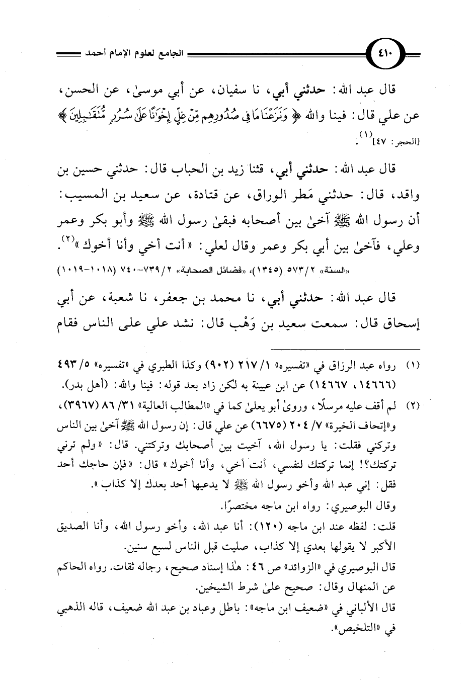 قال عبد اللَّه: حدثني أبي، نا سفيان، عن أبي موسى، عن الحسن، عن علي قال: فينا واللَّه {وَنَزَعْنَا مَا فِي صُدُورِهِمْ مِنْ غِلٍّ إِخْوَانًا عَلَى سُرُرٍ مُتَقَابِلِينَ (47)} [الحجر: 47] (¬1).