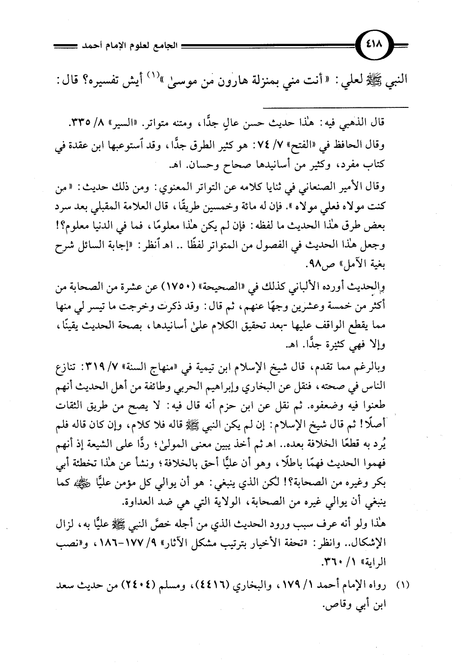 وقال الأمير الصنعاني في ثنايا كلامه عن التواتر المعنوي: ومن ذلك حديث: "من كنت مولاه فعلي مولاه". فإن له مائة وخمسين طريقًا، قال العلامة المقبلي بعد سرد بعض طرق هذا الحديث ما لفظه: فإن لم يكن هذا معلومًا، فما في الدنيا معلوم؟ ! وجعل هذا الحديث في الفصول من المتواتر لفظًا. . اهـ انظر: "إجابة السائل شرح بغية الآمل" ص 98.