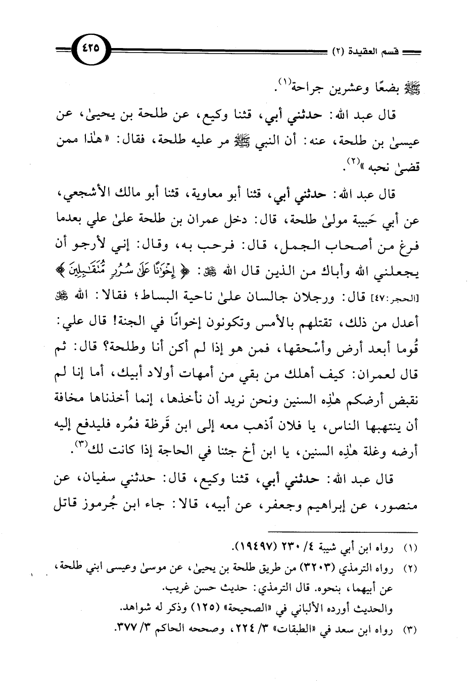 قال عبد اللَّه: حدثني أبي، قثنا أبو معاوية، قثنا أبو مالك الأشجعي، عن أبي حَبيبة مولى طلحة، قال: دخل عمران بن طلحة على علي بعدما فرغ من أصحاب الجمل، قال: فرحب به، وقال: إني لأرجو أن يجعلني اللَّه وأباك من الذين قال اللَّه: {إِخوَانًا عَلَى سُرُرٍ متَقَابِلِينَ} [الحجر: 47] قال: ورجلان جالسان على ناحية البساط؛ فقالا: اللَّه عَزَّ وَجَلَّ أعدل من ذلك، تقتلهم بالأمس وتكونون إخوانًا في الجنة! قال علي: قُوما أبعد أرض وأسْحقها، فمن هو إذا لم أكن أنا وطلحة؟ قال: ثم قال لعمران: كيف أهلك من بقي من أمهات أولاد أبيك، أما إنا لم نقبض أرضكم هذِه السنين ونحن نريد أن نأخذها، إنما أخذناها مخافة أن ينتهبها الناس، يا فلان اذهب معه إلى ابن قَرظة فمُره فليدفع إليه أرضه وغلة هذِه السنين، يا ابن أخ جئنا في الحاجة إذا كانت لك (¬3).