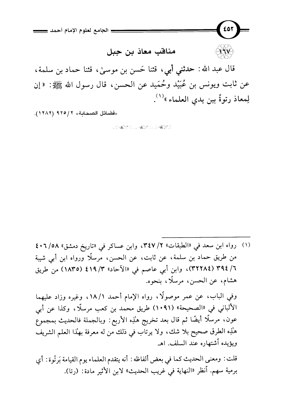 قال عبد اللَّه: حدثني أبي، قثنا حَسن بن موسى، قثنا حماد بن سلمة، عن ثابت ويونس بن عُبَيْد وحُمَيد عن الحسن، قال رسول اللَّه -صلى اللَّه عليه وسلم-: "إن لِمعاذ رتوةً بين يدي العلماء" (¬1).