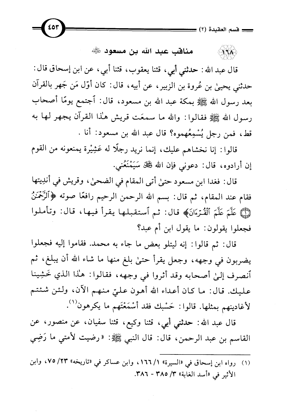 قال عبد اللَّه: حدثني أبي، قثنا يعقوب، قثنا أبي، عن ابن إسحاق قال: حدثني يحيى بن عُروة بن الزبير، عن أبيه، قال: كان أوّل مَن جَهر بالقرآن بعد رسول اللَّه -صلى اللَّه عليه وسلم- بمكة عبد اللَّه بن مسعود، قال: اجتمع يومًا أصحاب رسول اللَّه -صلى اللَّه عليه وسلم- فقالوا: واللَّه ما سمعَت قريش هذا القرآن يجهر لها به قط، فمن رجل يُسْمِعُهموه؟ قال عبد اللَّه بن مسعود: أنا.
