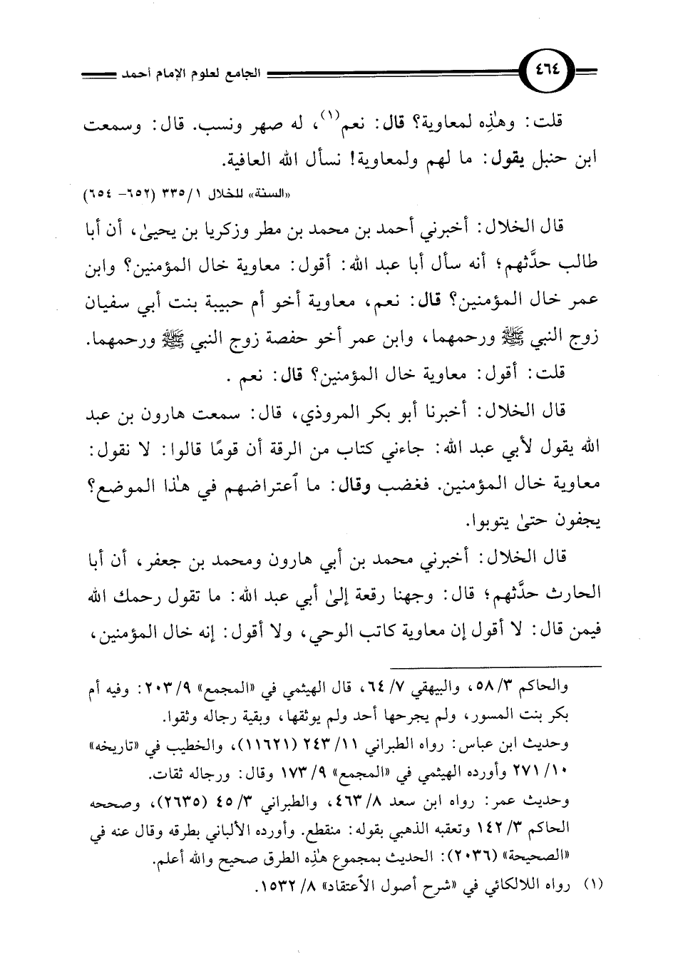 قال الخلال: أخبرني أحمد بن محمد بن مطر وزكريا بن يحيى، أن أبا طالب حدَّثهم؛ أنه سأل أبا عبد اللَّه: أقول: معاوية خال المؤمنين؟ وابن عمر خال المؤمنين؟ قال: نعم، معاوية أخو أم حبيبة بنت أبي سفيان زوج النبي -صلى اللَّه عليه وسلم- ورحمهما، وابن عمر أخو حفصة زوج النبي -صلى اللَّه عليه وسلم- ورحمهما.