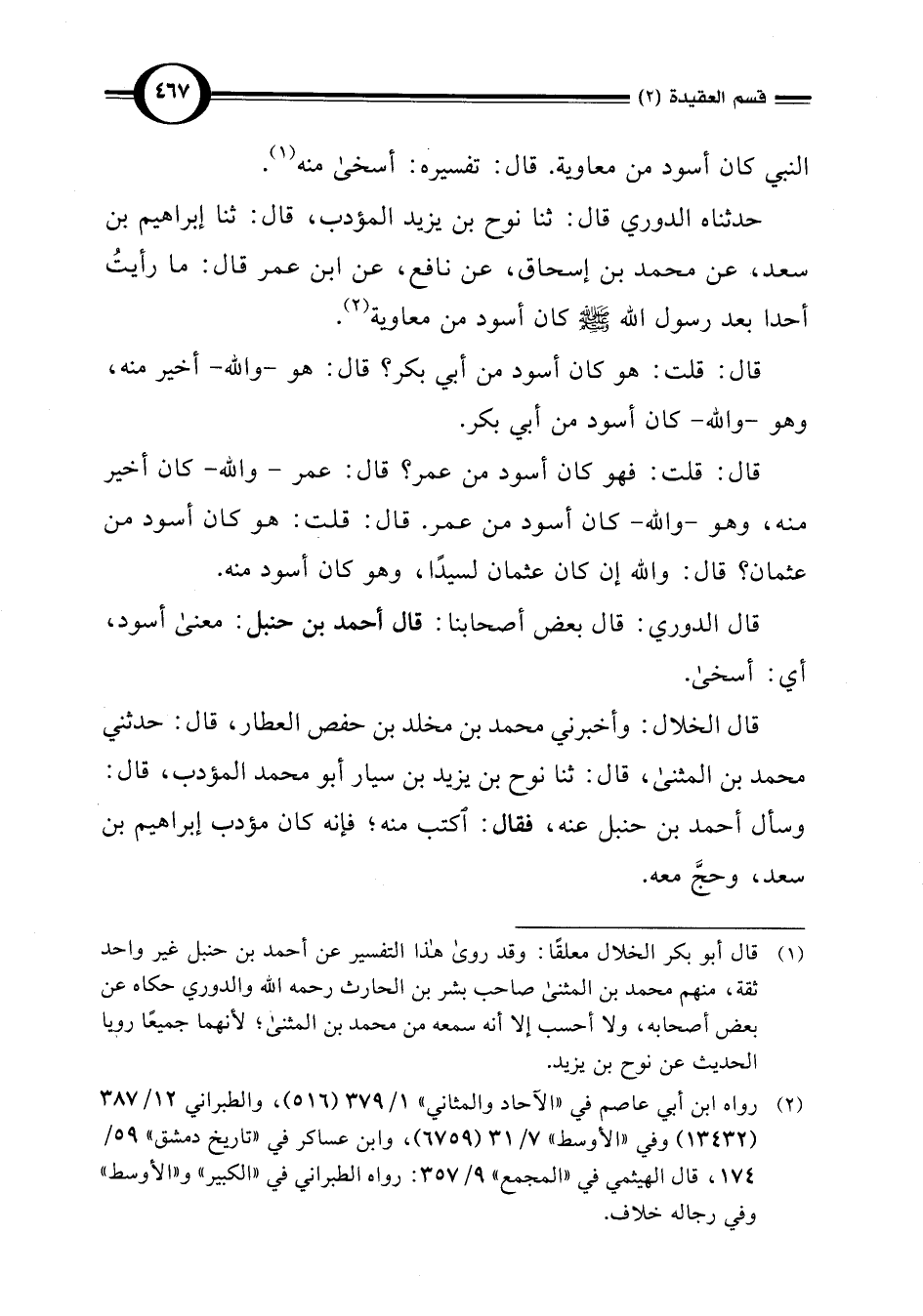 (¬1) قال أبو بكر الخلال معلقًا: وقد روى هذا التفسير عن أحمد بن حنبل غير واحد ثقة، منهم محمد بن المثنى صاحب بشر بن الحارث رحمه اللَّه والدوري حكاه عن بعض أصحابه، ولا أحسب إلا أنه سمعه من محمد بن المثنى؛ لأنهما جميعًا رويا الحديث عن نوح بن يزيد.